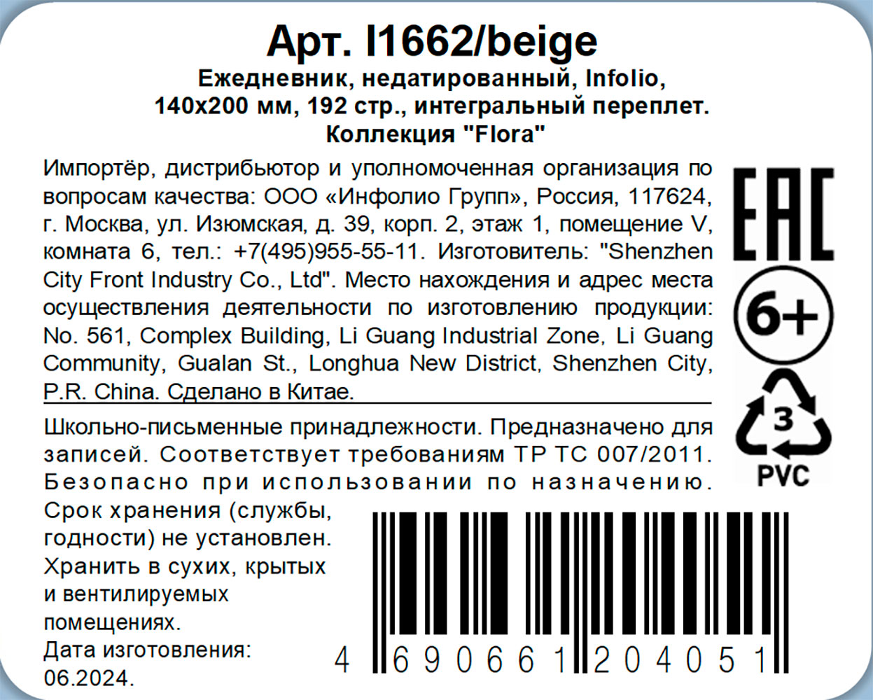 Обложка интегральная, фактурная матовая искусственная кожа с печатью по кожзаму, цвет бежевый. Блок - недатированный, 192 страницы, скругленные уголки, 2 ляссе, бумага: слоновая кость, скругленные уголки, 70г/м2, печать 2+2. Особенности: нашивка с тиснением фольгой.Ежедневник эксклюзивного дизайна Обложка ежедневника из высококачественной искусственной кожи с цветочным принтом. Информационный блок содержит: личные данные, планирование, важные даты.