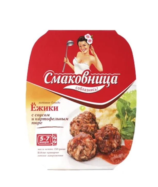 Ежики Смаковница с соусом и картофельным пюре, 350г состоят из шпика и говядины, риса, некоторых пищевых добавок. Приготовить их можно в микроволной печи или на сковороде. Подходят для быстрой подачи к столу.