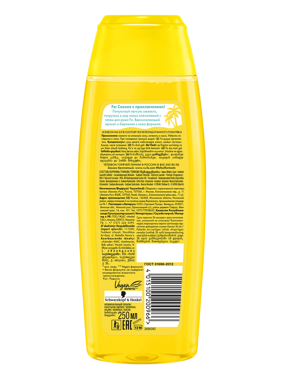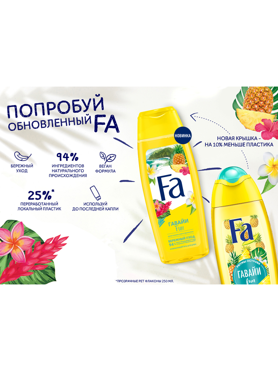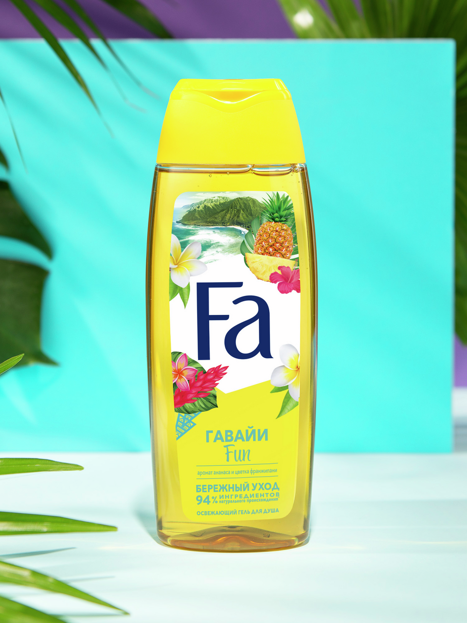 Fa: Смелее к приключениям! Почувствуй легкую свежесть, погрузись в мир новых впечатлений с освежающим гелем для душа Fa. Вдохновляющий аромат и бережная к коже формула. Аромат экзотических цветов. Содержит масло таману. >94% ингредиентов натурального происхождения*. Флакон на 25% состоит из переработанного пластика Бережный уход. Веган формула: не содержит ингредиентов животного происхождения.*вкл. воду.