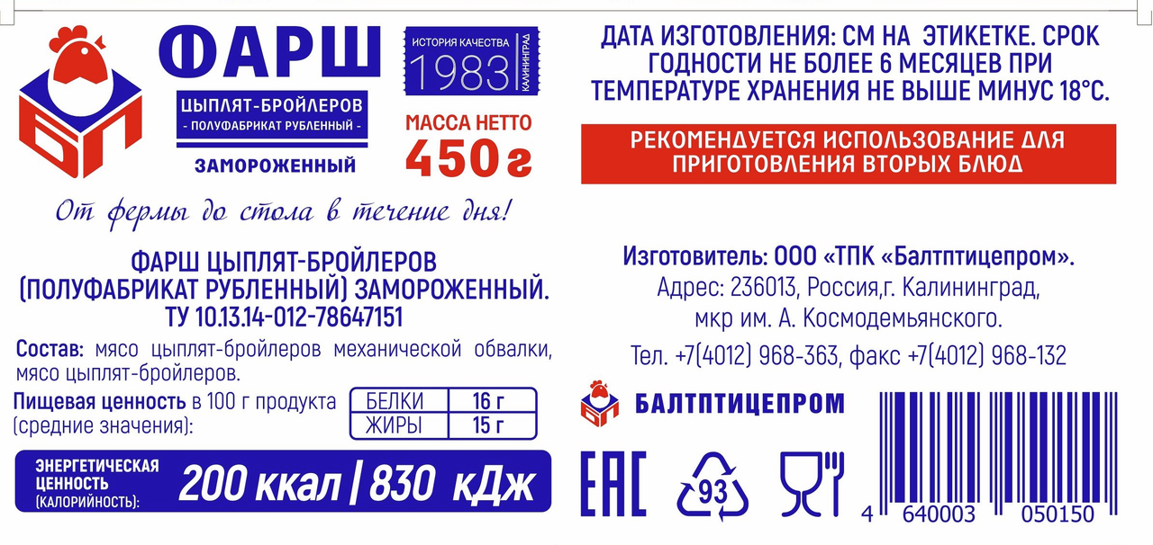 Фарш из мяса цыпленка-бройлера Балтптицепром замороженный, 450г