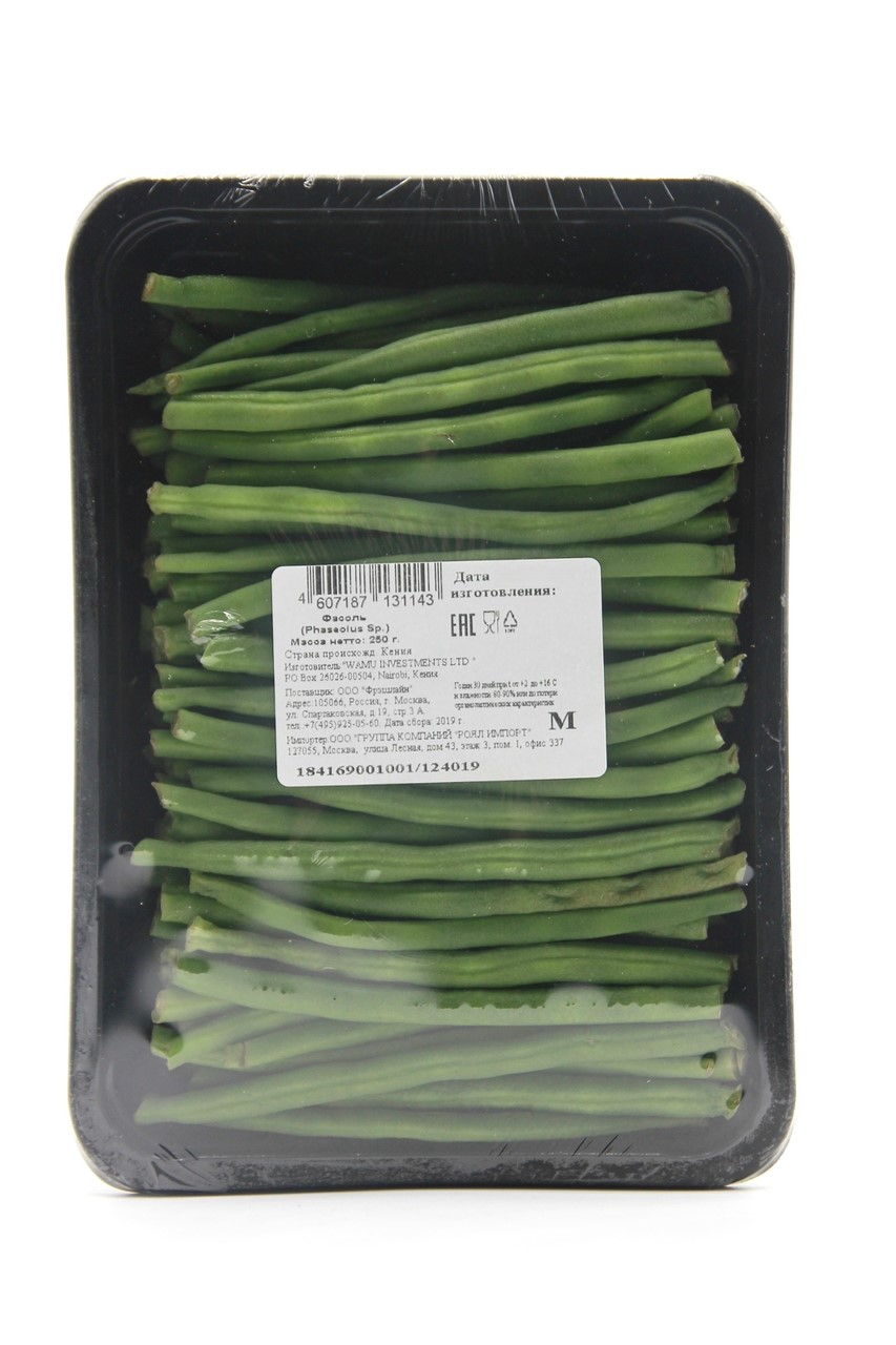 Свежая молодая фасоль в количестве 250 граммов помещена в коричневый контейнер. Эта овощная культура из семейства бобовых имеет сочные и нежные створки стручка, употребляемые в пищу. Употребляют овощ в вареном, тушеном, жареном виде. Спаржевая фасоль хорошо сочетается со сметанно-сырным, соевым соусом, грибами, курицей, яйцами, чесноком и другими продуктами.