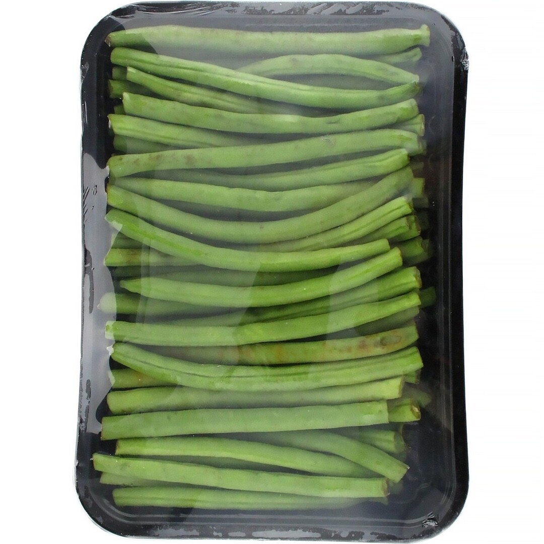 Свежая молодая фасоль в количестве 250 граммов помещена в коричневый контейнер. Эта овощная культура из семейства бобовых имеет сочные и нежные створки стручка, употребляемые в пищу. Употребляют овощ в вареном, тушеном, жареном виде. Спаржевая фасоль хорошо сочетается со сметанно-сырным, соевым соусом, грибами, курицей, яйцами, чесноком и другими продуктами.