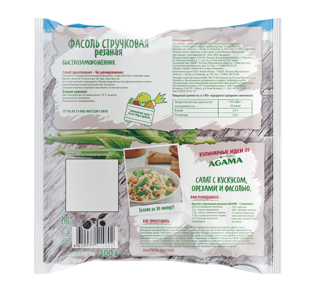 Фасоль стручковая Agama резаная подойдет для приготовления гарниров к мясу, птице, рыбе и морепродуктам, ее можно добавлять в супы, салаты, омлеты и запеканки. Продукт с нежной текстурой и приятным вкусом вносит разнообразие в привычный рацион и приносит пользу организму. Стручковая фасоль богата замедляющими старение антиоксидантами и витаминами, содержит калий, цинк, медь, фосфор, железо и другие элементы.