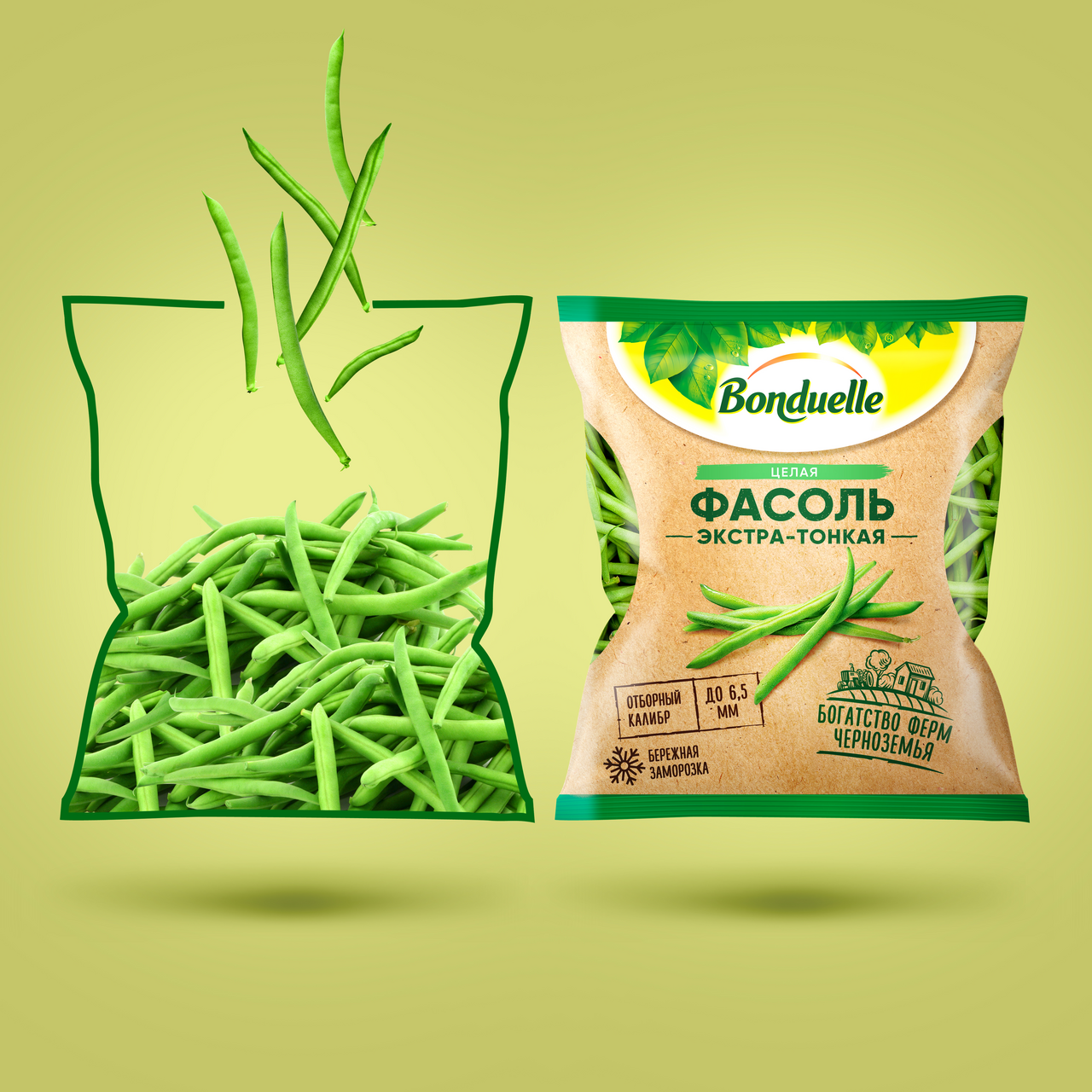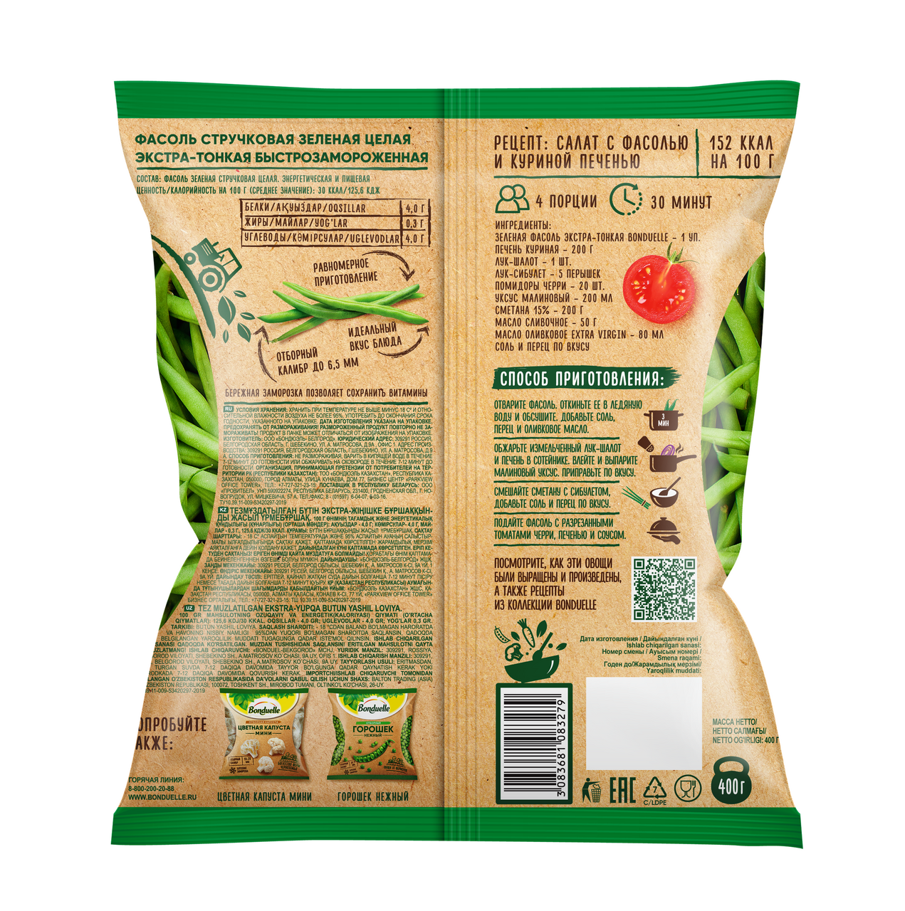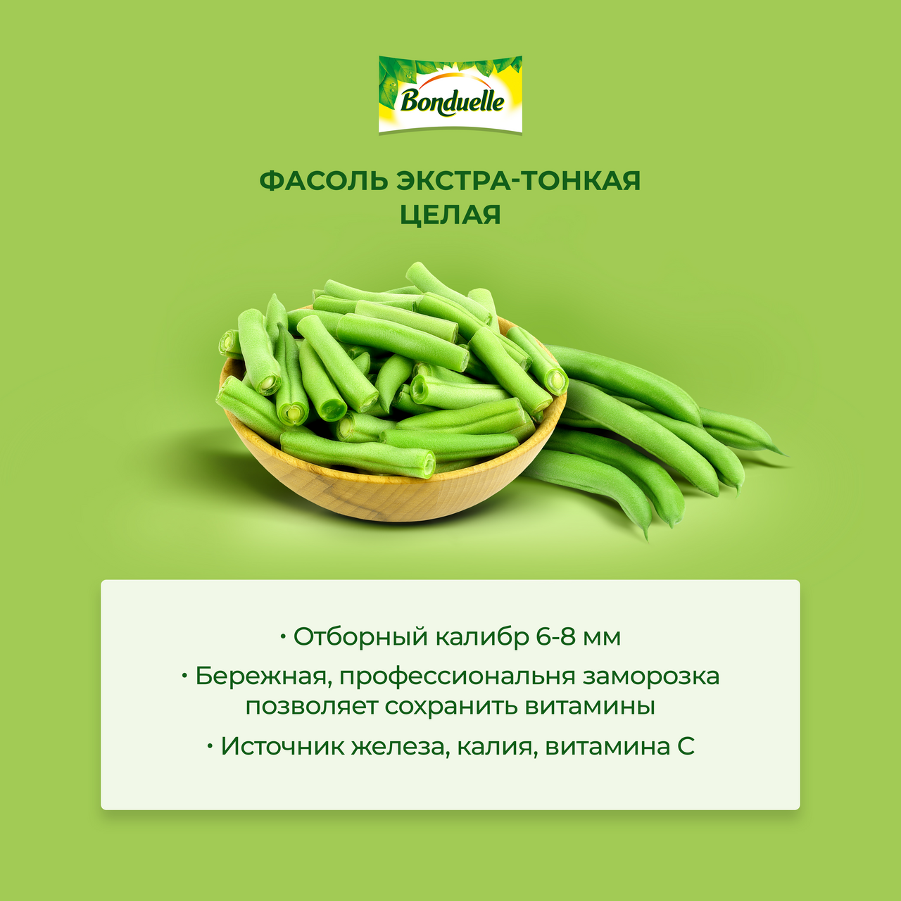 Замороженная резаная экстратонкая фасоль марки Бондюэль сохранила свою свежесть и нежность вкуса. Она будет хороша как самостоятельное блюдо в сочетании с пикантными или мягкими сливочными соусами и различными овощами, так и в качестве гарнира. А также из такой фасоли получаются изысканные салаты, которые придутся по вкусу даже искушенным гурманам.