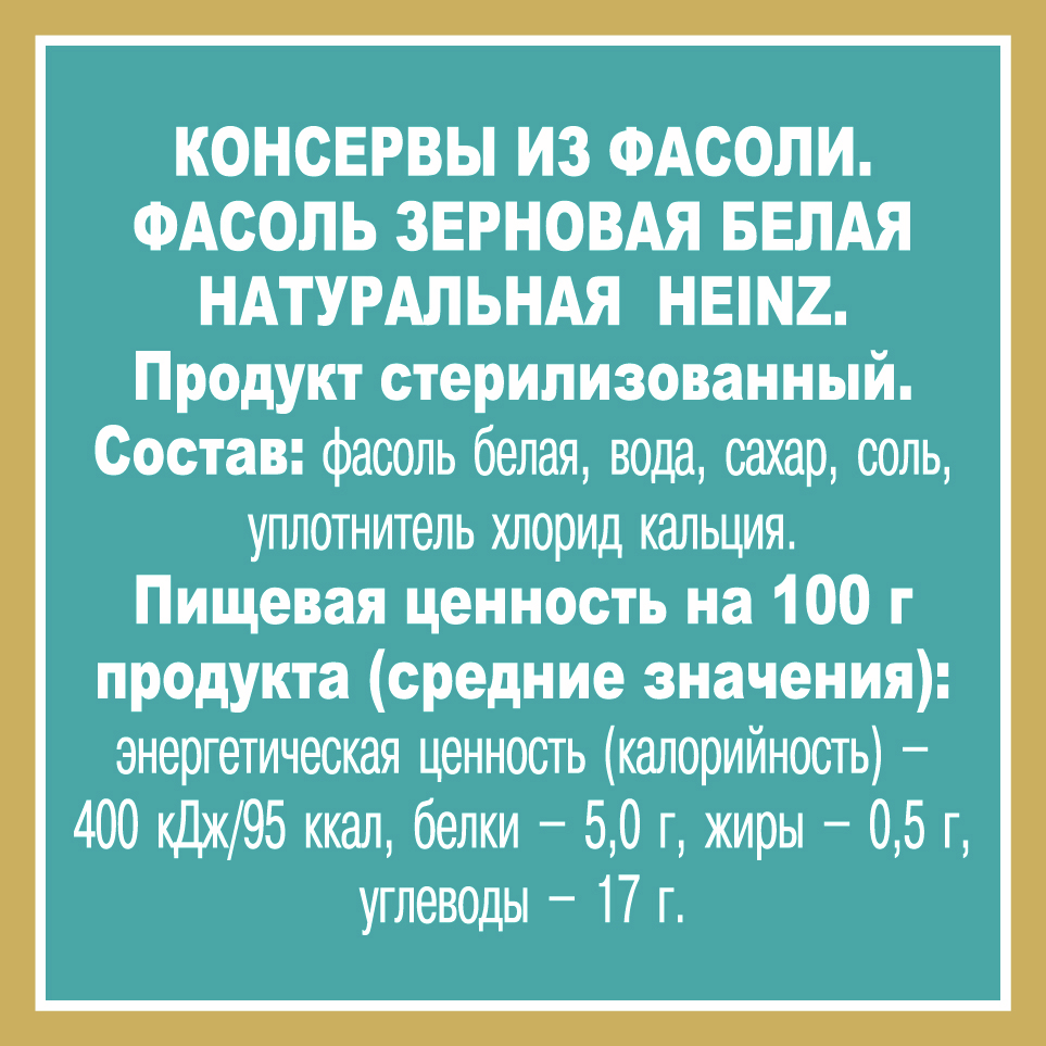 Консервированная белая фасоль Heinz составит основу многих вкусных блюд и выручит при нехватке времени для готовки. Отборное сырье и проверенные рецепты консервации Heinz гарантируют неизменный нежный вкус. Бобовая культура прекрасно подходит и для вегетарианского меню.
