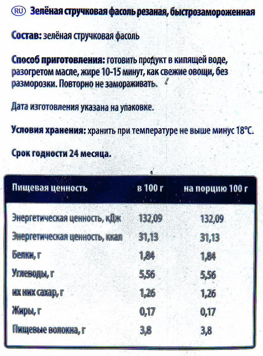 Фасоль зеленая стручковая быстрозамороженая. Овощи одного помологического сорта, зрелые, чистые, без повреждений насекомыми. Перед приготовлением овощи не требуют предварительной разморозки. Продукт послужит удачным гарниром к мясным и рыбным блюдам.