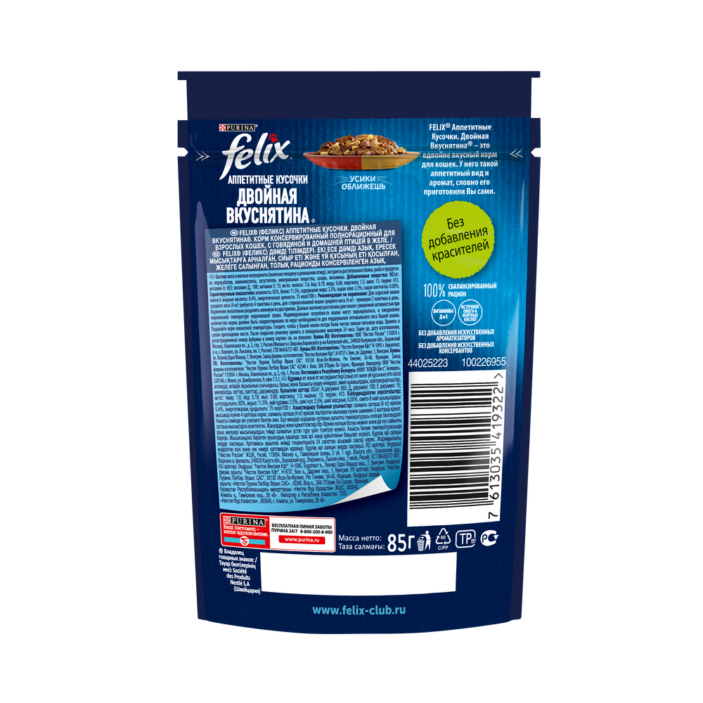 Корм влажный Felix Двойная вкуснятина Аппетитные кусочки в желе для взрослых кошек с говядиной и домашней птицей, 85г
