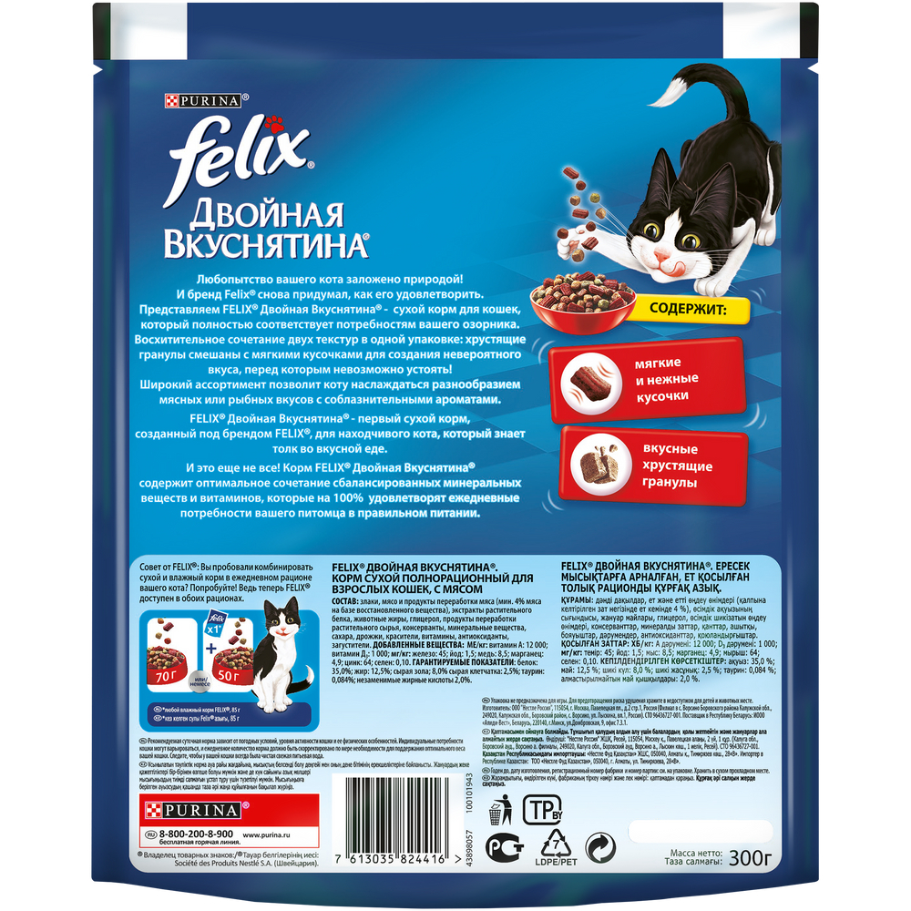 Лучше вкуснятины может быть только Двойная вкуснятина! Эксперты Purina приготовили для кошек с разборчивым вкусом рацион Felix Двойная Вкуснятина — корм для взрослых кошек, сочетающий два вида текстур: вкусные хрустящие гранулы и мягкие и нежные кусочки для полноты вкуса. Сухой корм Felix Двойная Вкуснятина полнорационный и содержит все необходимые для Вашего питомца ингредиенты.Сухие корма Felix не содержат искусственных красителей и консервантов.Вкус, перед которым невозможно устоять.Сочетание хрустящих гранул с мягкими и нежными кусочками.100% сбалансированный полный рацион.Содержит витамины А, Д, Е и таурин.Содержит качественный белок и незаменимые жирные кислоты.