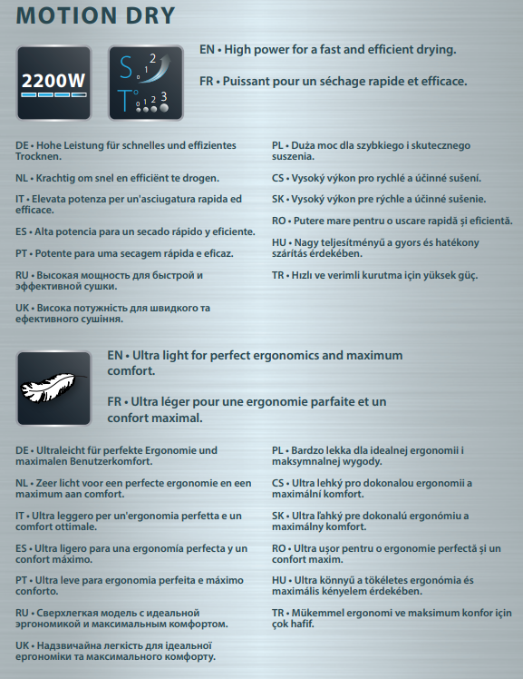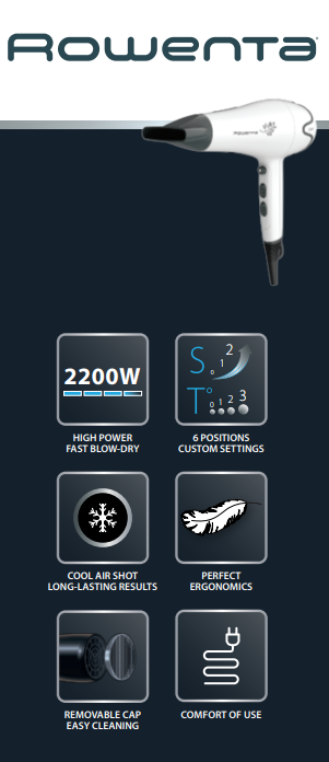 Скидка -55% за любую покупку от 5000 руб. в ТЦ METRO. Подробнее: https://online.metro-cc.ru/promo/rowenta/. Контроль над стилем - в ваших руках. Исключительная красота может быть естественной: это доказывает Pure Collection от Rowenta. Приборы линейки способны вывести ваш ежедневный ритуал красоты на новый уровень и подчеркнуть все природные достоинства ваших волос. Фен Rowenta Motion Dry обеспечивает высокую скорость сушки и полный контроль над процессом укладки. Благодаря 6 настройкам скорости и температуры воздушного потока, концентратору и диффузору ваши волосы будут выглядеть великолепно в считанные минуты, независимо от их типа и длины.