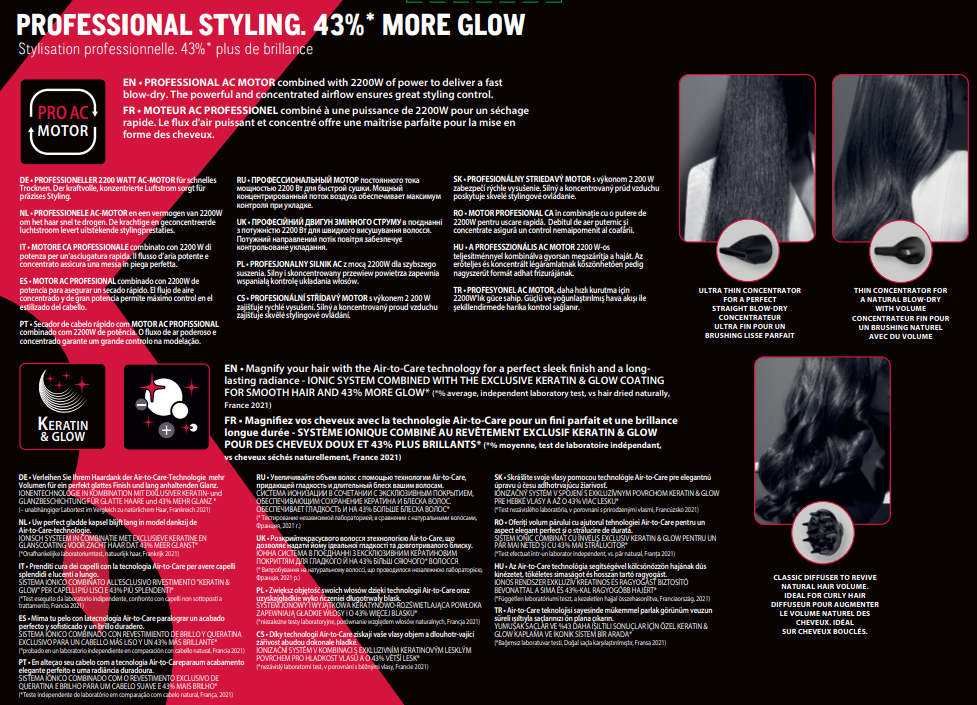 Скидка -55% за любую покупку от 5000 руб. в ТЦ METRO. Подробнее: https://online.metro-cc.ru/promo/rowenta/. Фен Rowenta Karl Lagerfeld Pro Stylist CV888LF0 с AC мотором рассчитан на длительную непрерывную работу. Есть три температурных режима. Наличие холодного воздуха позволяет закрепить укладку. Прибор дополнен функцией ионизации, которая устраняет статику и разглаживает пряди. Вес модели 0,840г, поэтому ее удобно использовать долгое время. Длинный кабель 1,8м не сковывает движения. Для комфортного хранения имеется петля для подвешивания. Высокопрочный материал корпуса устойчив к царапинам и трещинам. В комплекте присутствует концентратор 6мм для прямых укладок, концентратор 9 мм для пышной укладки, диффузор для придания дополнительного объема и бархатный чехол для хранения прибора. Фен легко чистить с помощью съемной задней крышки.