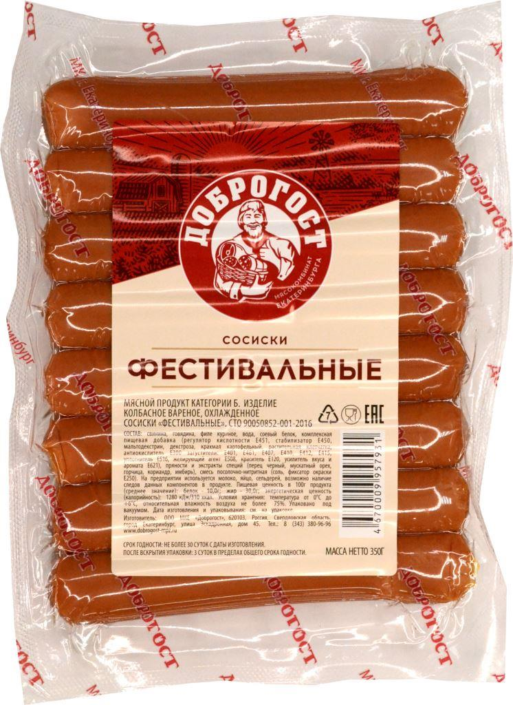 Сосиски фестивальные Доброгост, 350г – мясной продукт, приготовленный по классической рецептуре. Нежные, сочные сосиски с приятным вкусом и нежным ароматом пряностей. Плотная, однородная текстура без прожилок и хрящей позволяет аккуратно порезать сосиски на ровные куски. Продукт не разваривается, остается в первоначальной форме. Сосиски можно употреблять, как самостоятельное блюдо. Также они прекрасно сочетаются с картофел��ным пюре, макаронами, овощами и любой кашей. Их можно пожарить с яичницей – это будет прекрасный питательный завтрак, который зарядит энергией на целый день. Сосиски в тесте – прекрасный и быстрый перекус, выручат в дальней дороге и быстро утолят голод. Сосиски, пожаренные на мангале, с хрустящим хлебом и овощами, избавят вас от долгого приготовления пищи. Это вкусно, аппетитно, а главное быстро и удобно.