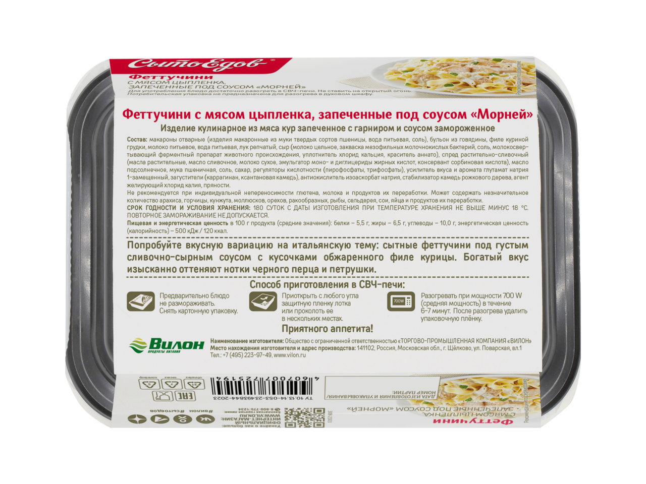 Курица жареная мясо курицы, лук репчатый, масло подсолнечное рафинированное дезодорированное, петрушка сушеная, чеснок, соль, перец черный молотый, феттучини отварные макаронные изделия в/с мука из зерна пшеницы твердых сортов, минеральная вода, масло сливочное, соль, соус бульон мясной вода питьевая, говядина, морковь, лук репчатый, молоко питьевое, лук репчатый, масло сливочное, мука пшеничная хлебопекарная в/с, масло подсолнечное рафинированное дезодорированное, соль, сыр молоко пастеризованное, соль, бактериальная закваска мезофильных и термофильных молочнокислых бактерий, молокосвертывающий ферментный препарат животного происхождения, пищевые добавки уплотнитель Е509, консервант Е252, краситель Е160b.