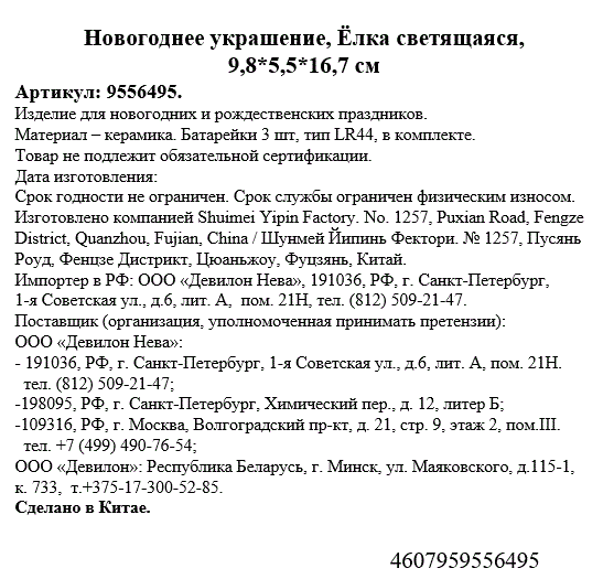 Фигура выполнена из пластикового материала. В фигуру встроены светодиоды. Подсветка работает от батареек, есть выключатель.