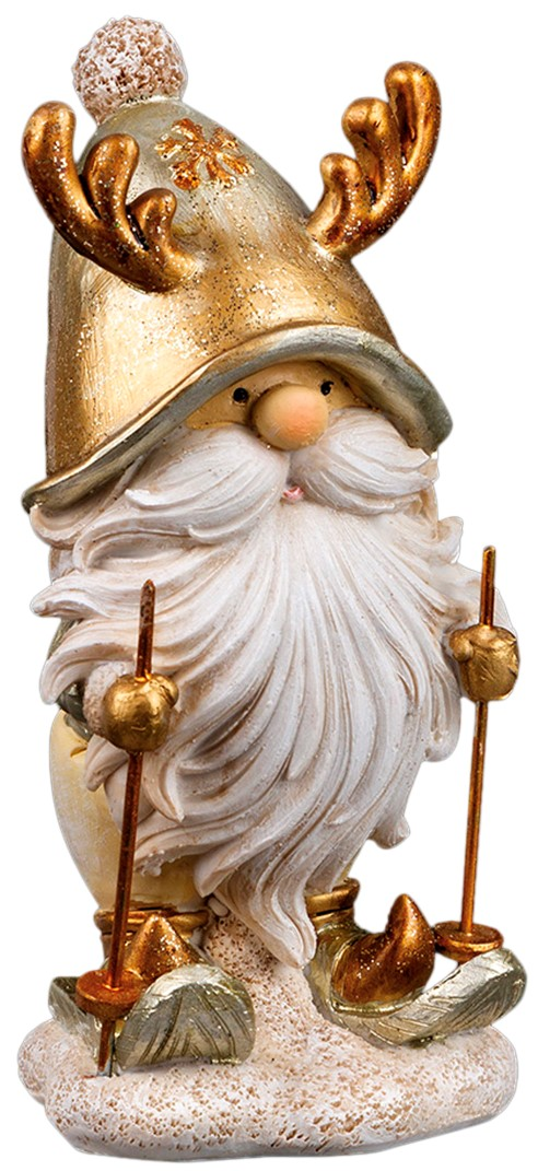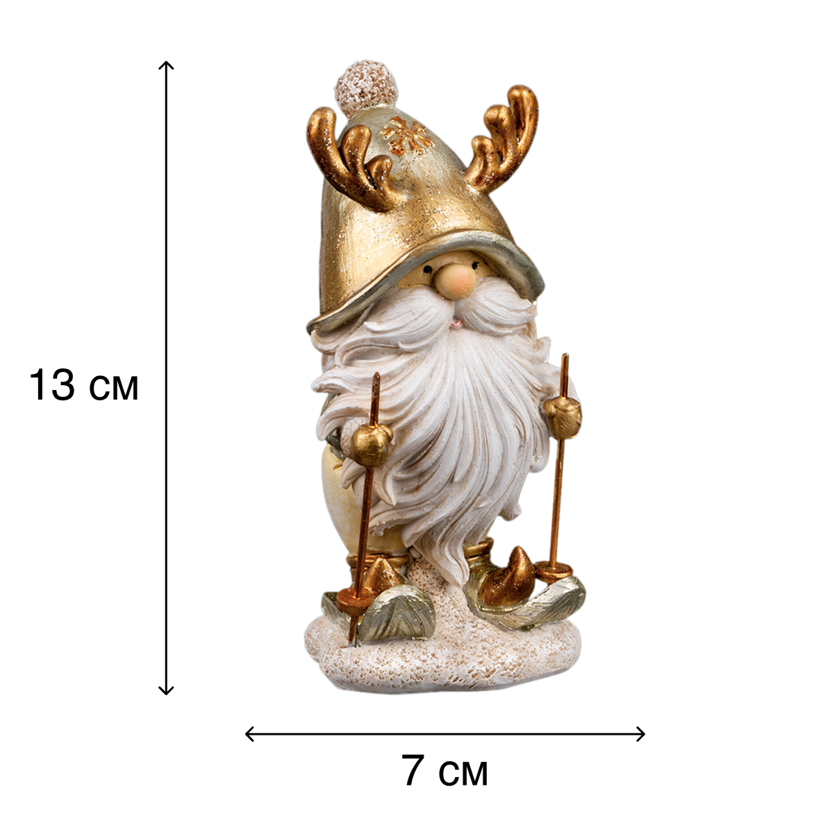 Забавный гном на лыжах выполнен в золотом цвете. Оригинальная шапка с рогами, как у викинга, привлекает внимание. Милый сувенир отлично впишется в любой интерьер и поможет создать атмосферу волшебства и уюта. Групповая упаковка предназначена только для безопасной транспортировки и хранения.