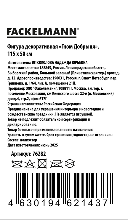 Фигура Fackelmann Гном Добрыня зеленый, 115 x 50см — стильное украшение от бренда Fackelmann, созданное для новогоднего интерьера. Эта декоративная фигура высотой 115 см и шириной 50 см, вес 1700 гр., выполненная с вниманием к деталям, станет ярким акцентом в праздничном убранстве вашего дома. Изготовлена из качественных материалов: микровельвет, искусственный мех, мягкий наполнитель — синтепон. Фигура выполнена в спокойных зеленых оттенках, а колпак украшает элемент в виде шишки. Милый Гном в новогоднем колпачке легко разместится на любой горизонтальной поверхности благодаря центру тяжести, расположенному в корпусе фигуры. Фигура отлично дополнит новогодний декор, создаст уютную атмосферу и станет оригинальным подарком близким. Изделие не является детской игрушкой. Использовать только в декоративных целях.