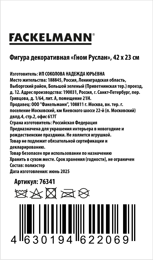 Фигура Fackelmann Гном Руслан красный, 42 x 23см — стильное украшение от бренда Fackelmann, созданное для новогоднего интерьера. Эта декоративная фигура высотой 42 см и шириной 23 см, вес 463 гр., выполненная с вниманием к деталям, станет ярким акцентом в праздничном убранстве вашего дома. Изготовлена из качественных материалов: прочный фетр, искусственный мех, мягкий наполнитель — синтепон. В оформлении фигуры использован благородный узор шотландской клетки и отделка бархатом. Колпак гнома оформлен двусторонними красно-золотыми пайетками, благодаря чему гном эффектно переливается в интерьере и создаёт праздничную атмосферу. Милый Гномик в новогоднем колпачке легко разместится на любой горизонтальной поверхности благодаря центру тяжести, расположенному в корпусе фигуры. Фигура отлично дополнит новогодний декор, создаст уютную атмосферу и станет оригинальным подарком близким. Изделие не является детской игрушкой. Использовать только в декоративных целях.