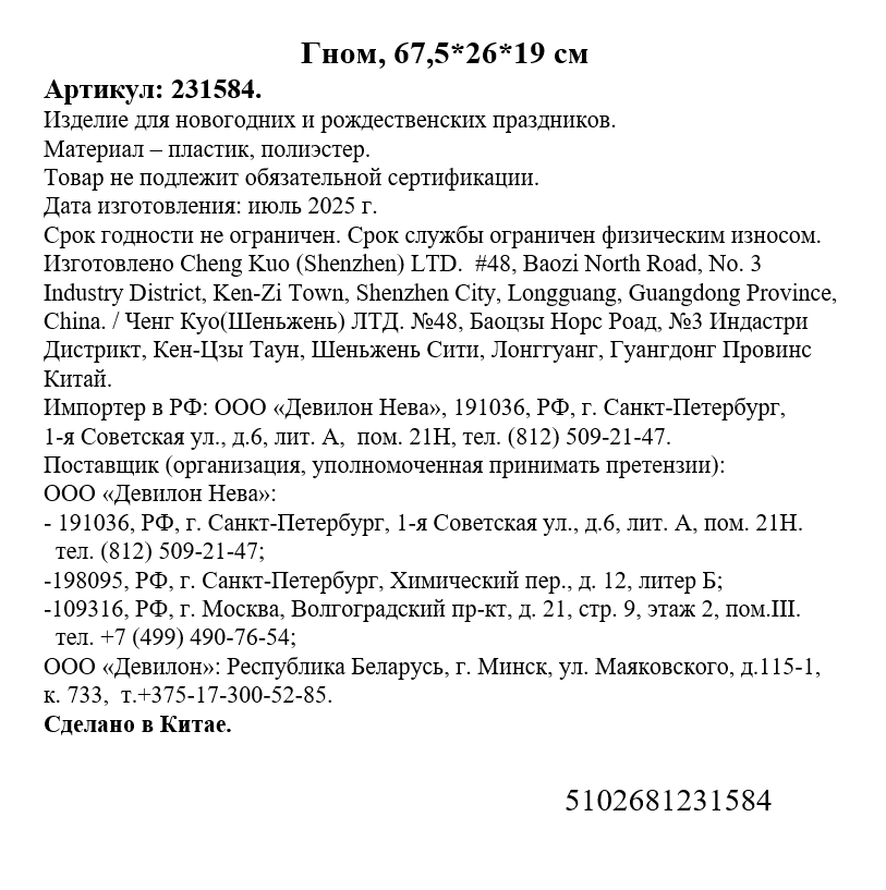 Фигура Гном серый, 67.5 x 26 x 19см - идеальное украшение для вашего дома в период самого душевного праздника, а также отличное дополнение к основному подарку родным и близким! Фигура приятна на ощупь, изготовлена из высококачественных материалов. Гном новогодний прекрасно дополнит любой интерьер. Милый Гномик в новогоднем колпачке легко разместится на любой горизонтальной поверхности благодаря центру тяжести, расположенному в корпусе фигуры. Рекомендации по использованию указаны на вшивном ярлыке изделия. Внимание! Изделие не является детской игрушкой. Использовать только в декоративных целях.
