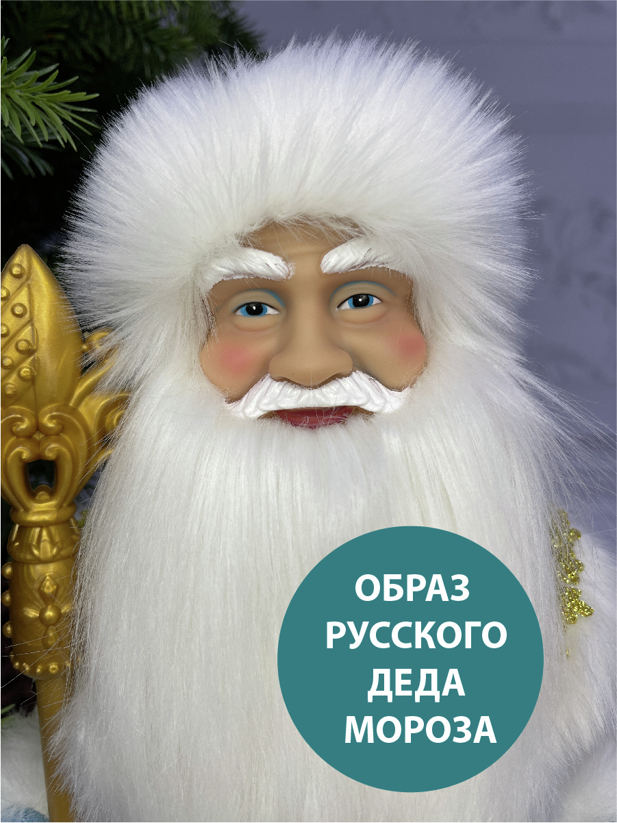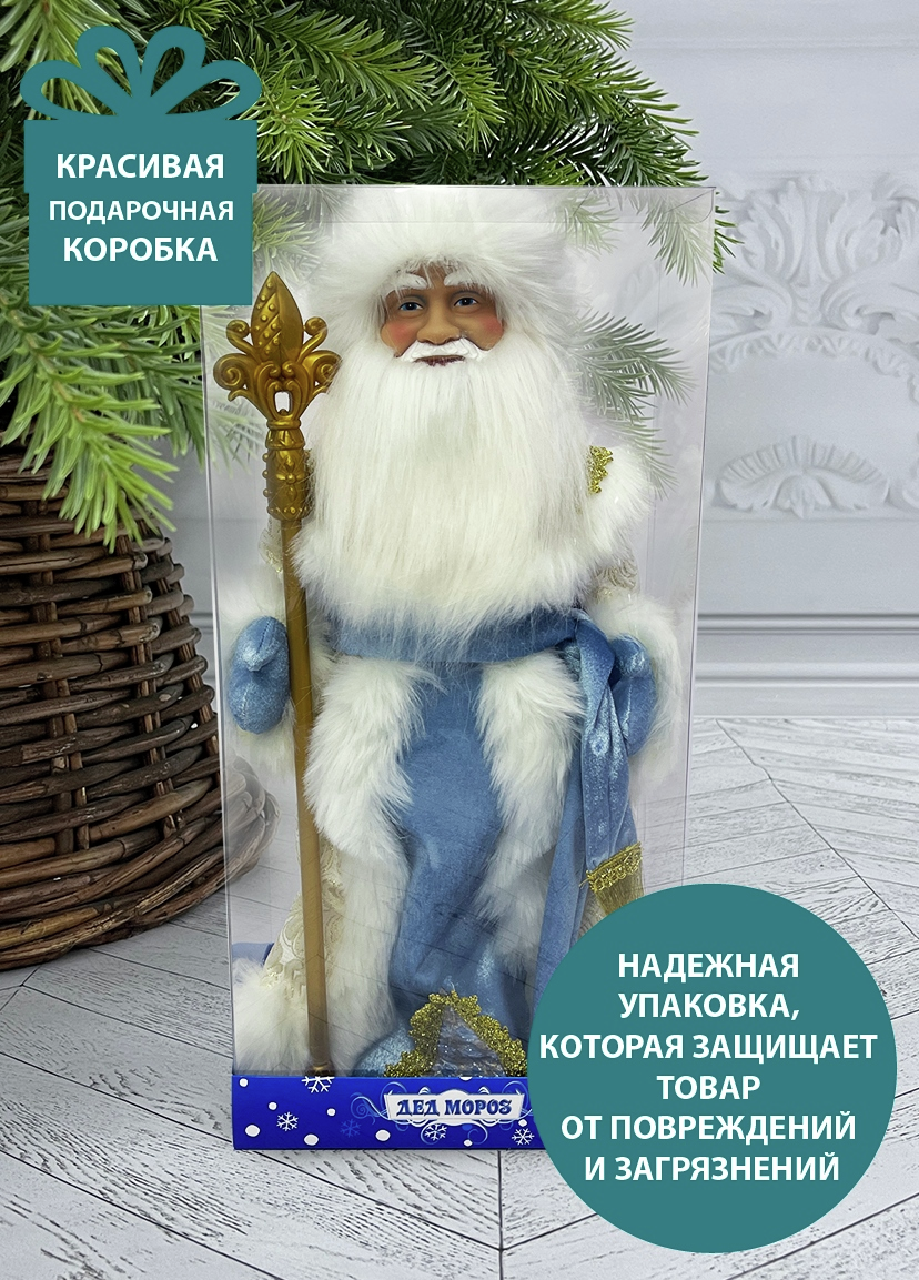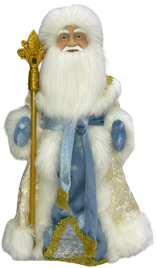 Он словно из сказки явился с волшебным золотым посохом и мешком подарков, чтобы напомнить о праздничном чуде. Красочно наряжен в белую шапку и в эпический золотисто-белый кафтан с голубым поясом и перчатками, а высота его составляет 50см. Такая фигурка несомненно украсит дом или композицию, добавив родителям и взрослым приятной ностальгии, а деткам ощущения новогоднего волшебства. Это отличный подарок на Новый год или Рождество для любимых людей. Милая фигурка станет уютным аксессуаром в новогоднем интерьере любого стиля. Фигурка порадует и детей, и взрослых, украсив собой праздничное убранство дома или офиса.