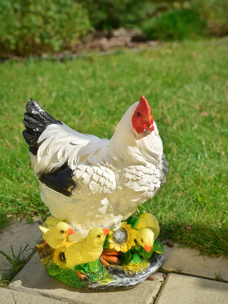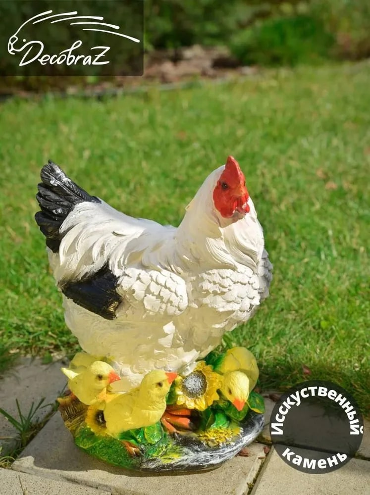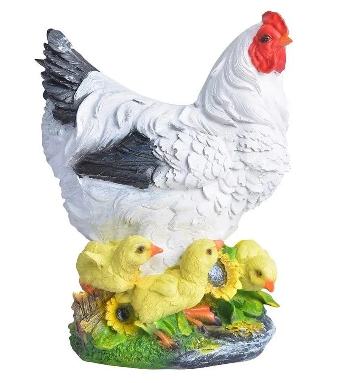Декоративная статуэтка курицы, выполненная из искусственного камня - полистоуна. Такая статуэтка отлично впишется в интерьер в качестве декоративного элемента. Садовая фигура из полистоуна легко переносит любые атмосферные воздействия в виде дождя, града, снега, температуру широкого диапазона: от -50 до +180 градусов, не реагирует на высокую или низкую влажность, устойчива к солнечному излучению. К несомненным достоинствам полистоуна можно отнести его экологическую безопасность. Садовая скульптура подходит как для размещения на открытом воздухе, так и в помещении. Садовую декоративную фигуру можно использовать как декор для вашего сада и огорода, как дополнение любых декораций, а может выступать и в качестве подарка.