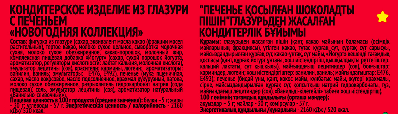 Фигурка из глазури (сахар, эквивалент масла какао (фракции масел растительных), тёртое какао, молоко сухое цельное, сыворотка молочная сухая, молоко сухое обезжиренное, какао-порошок, молочный жир, комплексная пищевая добавка Йогурт (сахар, сухой порошок йогурта, ароматизатор, регуляторы кислотности: лактат кальция, молочная кислота), эмульгатор лецитины (соя), красители: кармины, лютеин; ароматизаторы: ванилин, ваниль; эмульгаторы: Е476, Е492), печенье (мука пшеничная, сахар, масло кокосовое, масло подсолнечное, крахмал кукурузный, патока, молоко сухое обезжиренное, разрыхлитель гидрокарбонат натрия (сода пищевая), соль, эмульгатор лецитины (соя), ароматизатор натуральный Ванильно-сливочный).