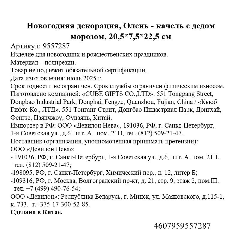 Фигурка Олень-качель с Дедом Морозом, 20.5 x 7.5 x 22.5см