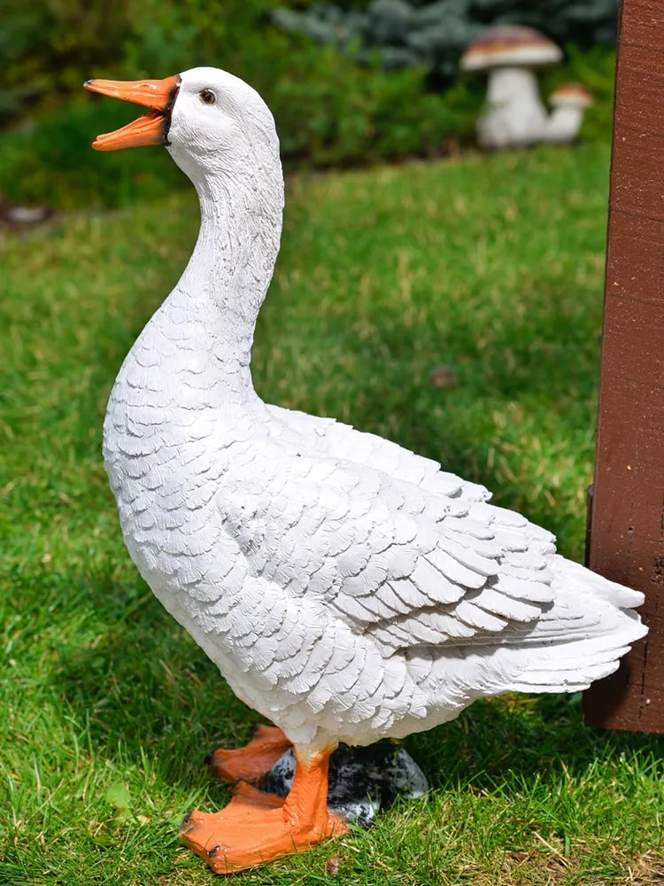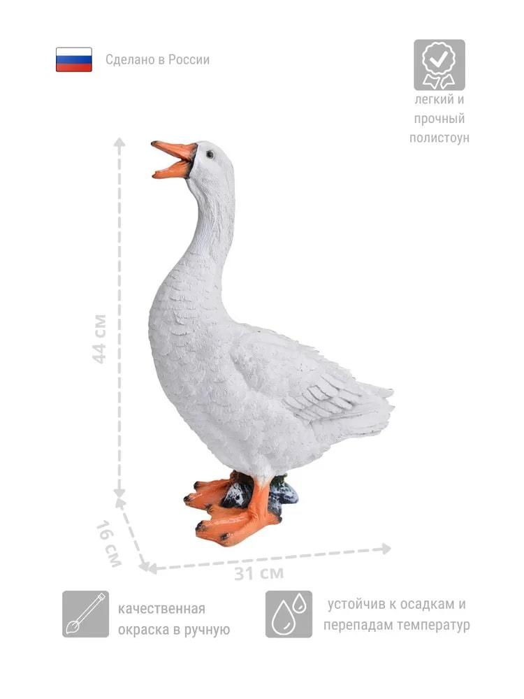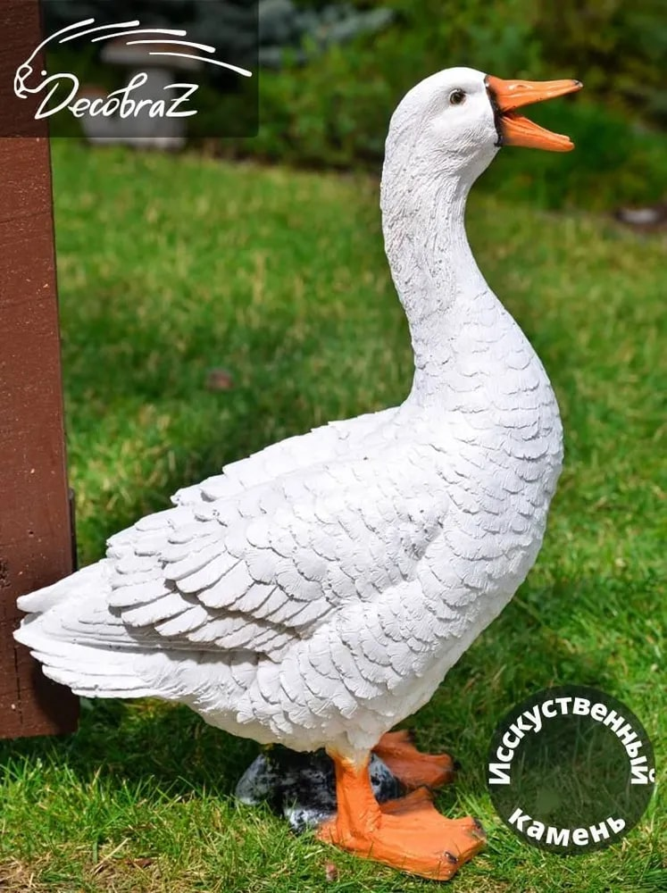 Декоративная статуэтка гуся, выполненная из искусственного камня - полистоуна. Такая статуэтка отлично впишется в интерьер в качестве декоративного элемента. Садовая фигура из полистоуна легко переносит любые атмосферные воздействия в виде дождя, града, снега, температуру широкого диапазона: от -50 до +180 градусов, не реагирует на высокую или низкую влажность, устойчива к солнечному излучению. К несомненным достоинствам полистоуна можно отнести его экологическую безопасность. Фигурку Гуся можно расположить на пол, газон, альпийскую горку, клумбу и тд. Садовая скульптура подходит как для размещения на открытом воздухе, так и в помещении.