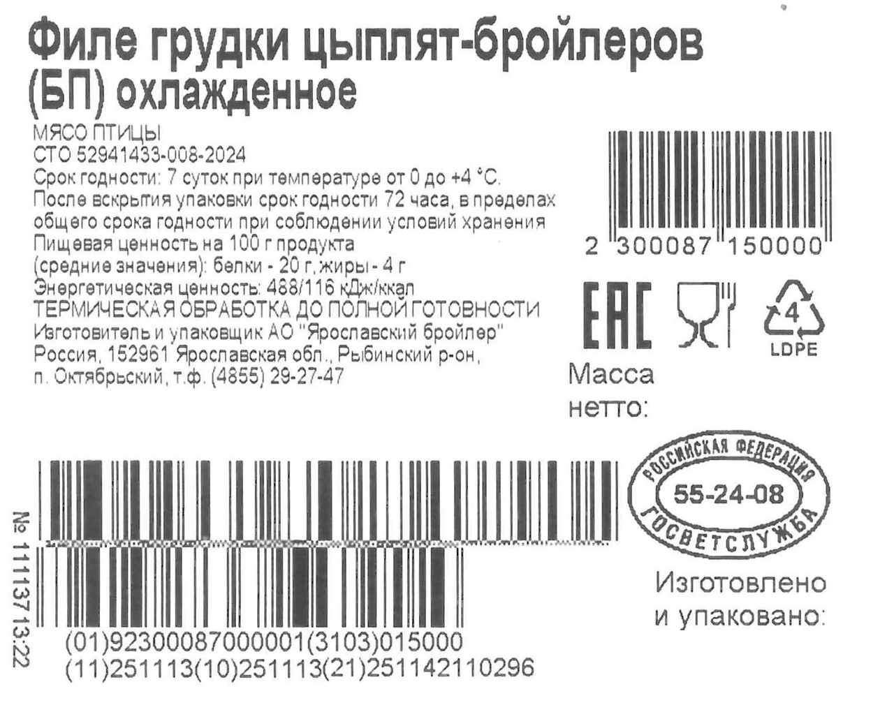 Филе грудки цыпленка-бройлера Ярославский бройлер охлажденное, ~14кг
