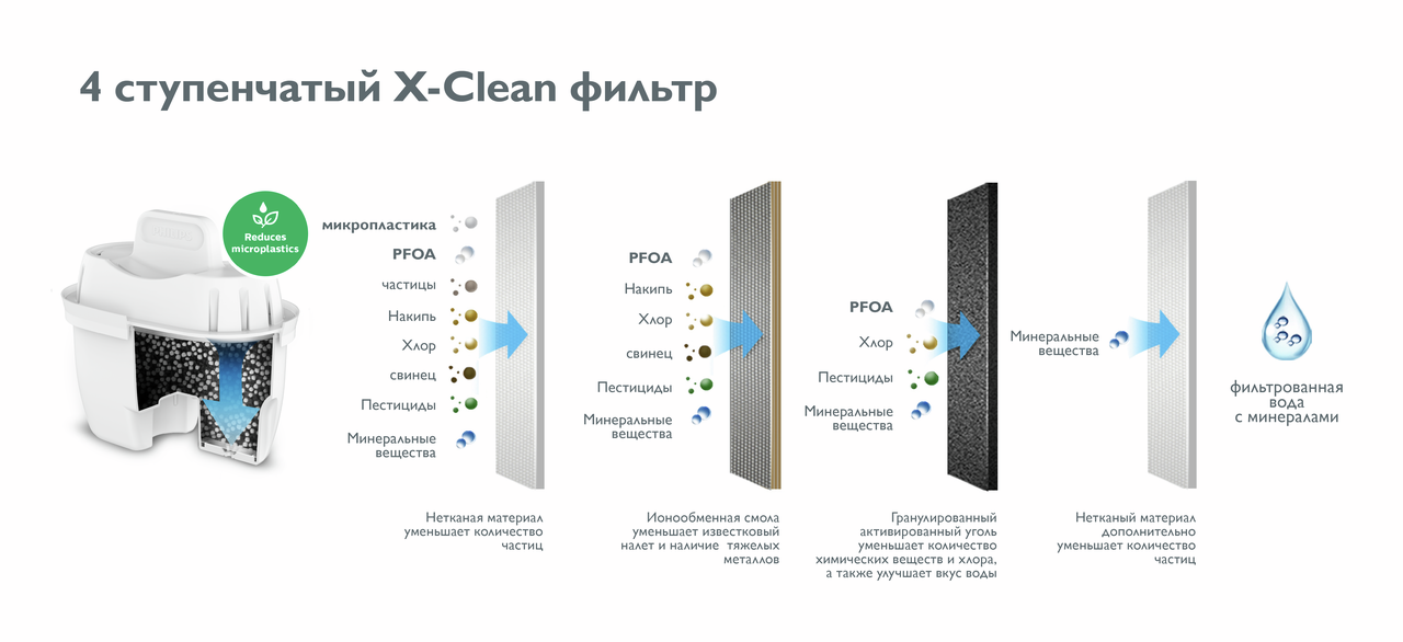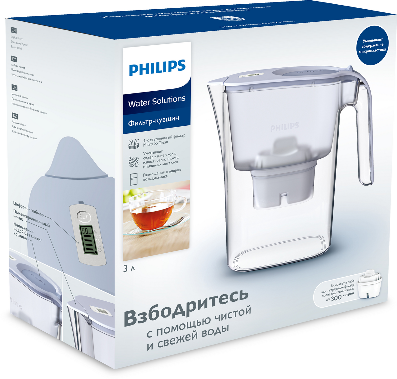 Наслаждайтесь чистой и вкусной водой, а также различными горячими и холодными напитками. Фильтр Philips Micro X-Clean задерживает хлор, известь, тяжелые металлы и другие нежелательные частицы, например микропластик и ПФОК. Цифровой таймер покажет оптимальное время для замены фильтра. Откидная крышка позволит наполнить кувшин одной рукой. Удобный носик всегда защищает фильтрованную воду от пыли. Уникальные преимущества фильтров PHILIPS:- Активированный уголь из скорлупы кокосового ореха – наилучший абсорбирующие свойства- Нетканый фильтрующий материал – от микропластика- 4-х ступенчатая фильтрация. Пейте вкусную воду и экономьте, не покупая воду в бутылках. Продлевает срок службы кухонных приборов, предотвращая скопление накипи. Ресурс одного картриджа - 300 литров, а скорость фильтрации 0,3 литра в минуту.