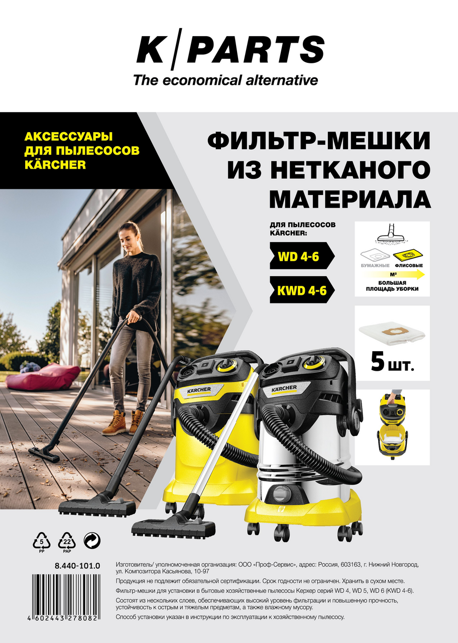 Исключительно прочные на разрыв фильтр-мешки, с высокой эффективностью фильтрации. Значительно продлевают время работы по сравнению с бумажными фильтр-мешками. Подходят к аппаратам: WD 4 Premium, WD 5 Premium, WD 6 P Premium. Невероятно высокая устойчивость к разрывам. Большая вместимость фильтр мешка и более долгая работа без замены в сравнении с бумажными мешками. Кроме того, по сравнению с бумажными аналогами срок эксплуатации таких изделий гораздо дольше.