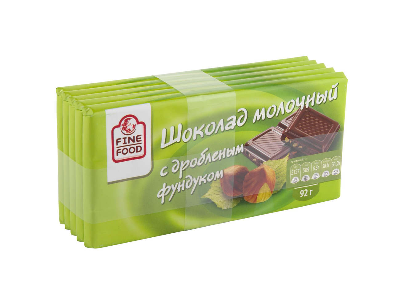 Шоколад молочный с дробленным фундуком Fine Food, 5 штук по 92 г. Состав: сахар, молоко сухое, какао масло, какао тертое, ядро фундука жареное дробленое, эквивалент какао масла, эмульгатор (лецитин соевый, Е476), ароматизатор идентичный натуральному ванилин. Противопоказано при индивидуальной непереносимости к белку молока. Содержит до 5% растительных жиров - эквивалентов. Массовая доля общего сухого остатка какао в шоколадной массе 25,5%. Массовая доля сухого обезжиренного остатка какао в шоколадной массе 4,5 %. Массовая доля общего сухого остатка молочных продуктов в шоколадной массе 19,8%. Массовая доля молочного жира в шоколадной массе 4,9%. Массовая дорля насыщенных жирный кислот 16,6%. Массовая доля трансизомеров ненасыщенных жирных кислот 0,044%. Пищевая ценность в 100 г: белки - 6,7 г, углеводы - 55,8 г, жиры - 31,3 г. Энергетическая ценность: 532 ккал. Хранить при температуре от 15 до 21С и относительной влажности воздуха не более 75%. Срок годности: 12 месяцев.