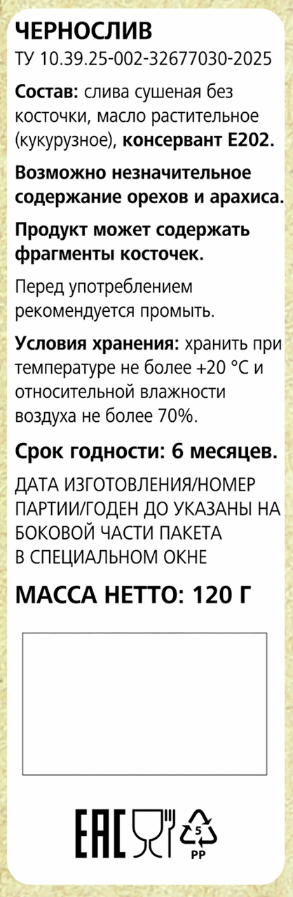 Слива сушеная без косточки, масло растительное (кукурузное), консервант Е202.