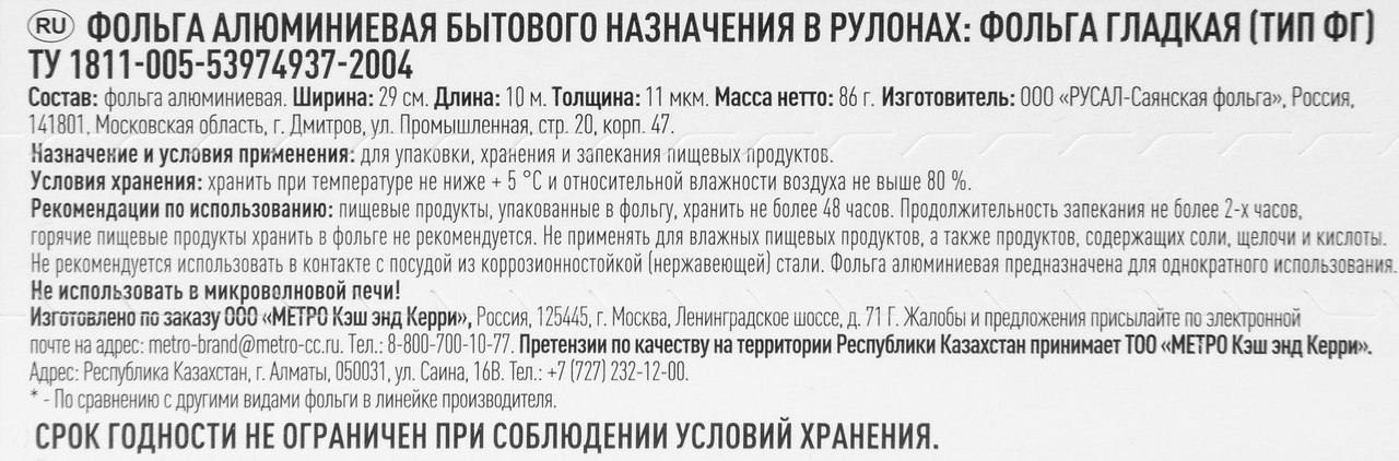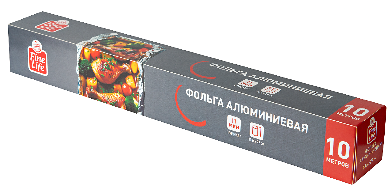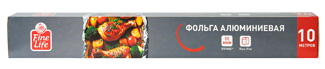 Fine Life Фольга 290мм 11мкм, 10м отлично подходит для упаковки, хранения и заморозки продуктов, а также для прихотовления блюд в духовке. Продукты не будут пригорать и сохранят свой естественный аромат и сочность.