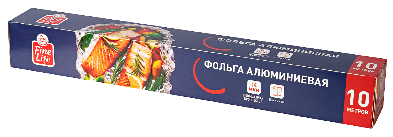 Fine Life Фольга 290мм 14мкм, 10м благодаря повышенной прочности обладает улучшенной термостойкостью, устойчивостью к повреждениям и разрывам, что делает ее идеальным выбором для длительного запекания мяса, рыбы или овощей. Фольга поможет дольше сохранить температуру готового блюда и не пропускает посторонние запахи.