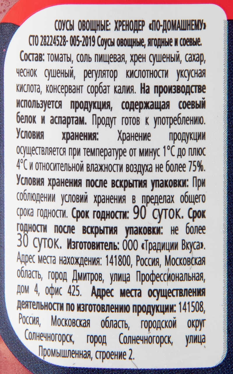 Хренодер в удобной пластиковой бутылочке в меру острый, пикантный. Можно использовать с различными блюдами - добавлять к холодцу, заливному, салатам, супам, и даже просто намазывать на любимый хлеб. Произведен по традиционной рецептуре из пропущенных через мясорубку помидоров, корня хрена и чеснока. Отличное сочетание острых вкусов и ярких ароматов. Пикантный хренодер идеально подходит к мясу, сосискам, пельменям, картофелю, макаронам, рису и черному хлебу.