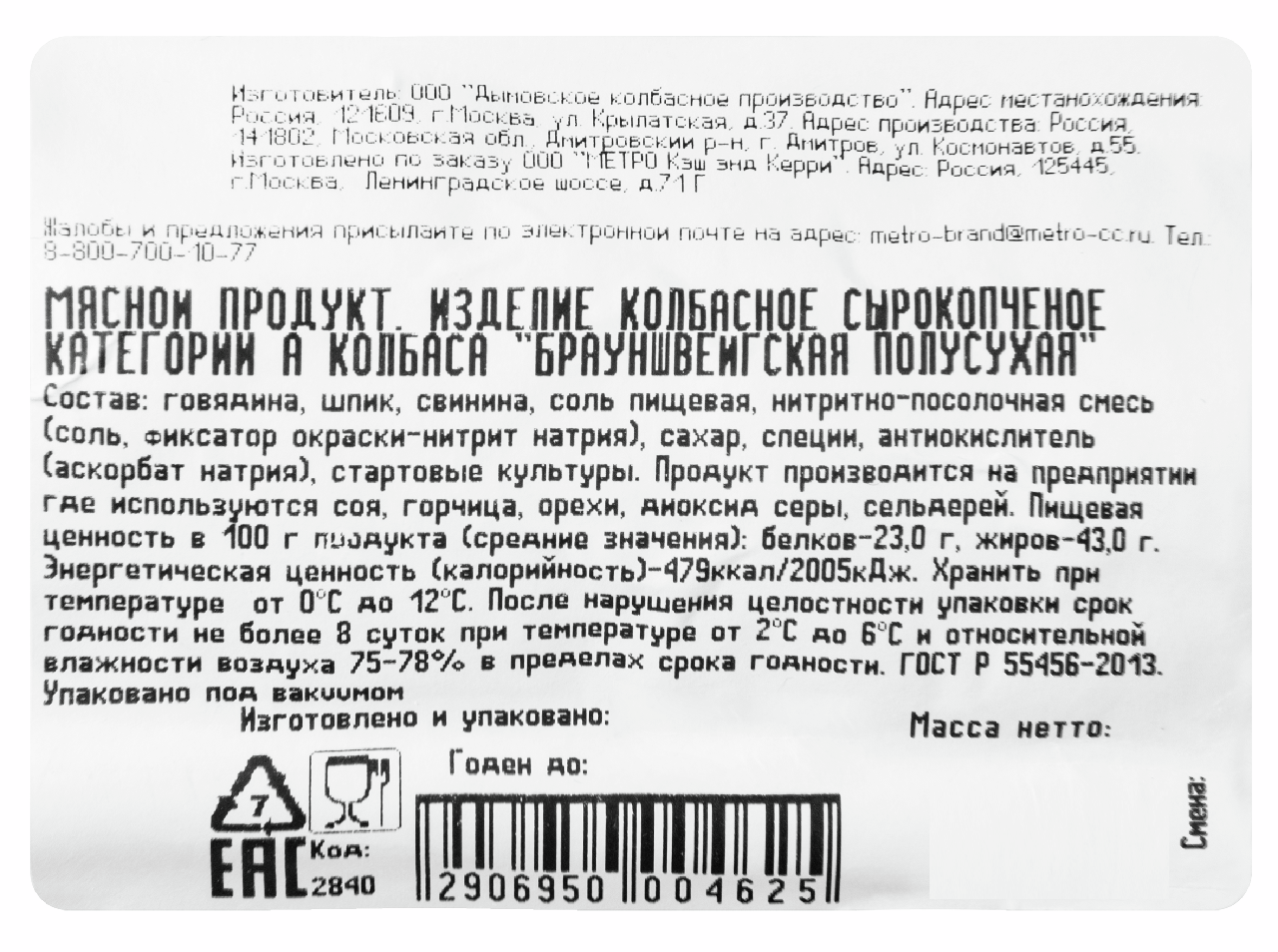 Fine Life Колбаса Брауншвейгская полусухая сырокопченая, ~500г
