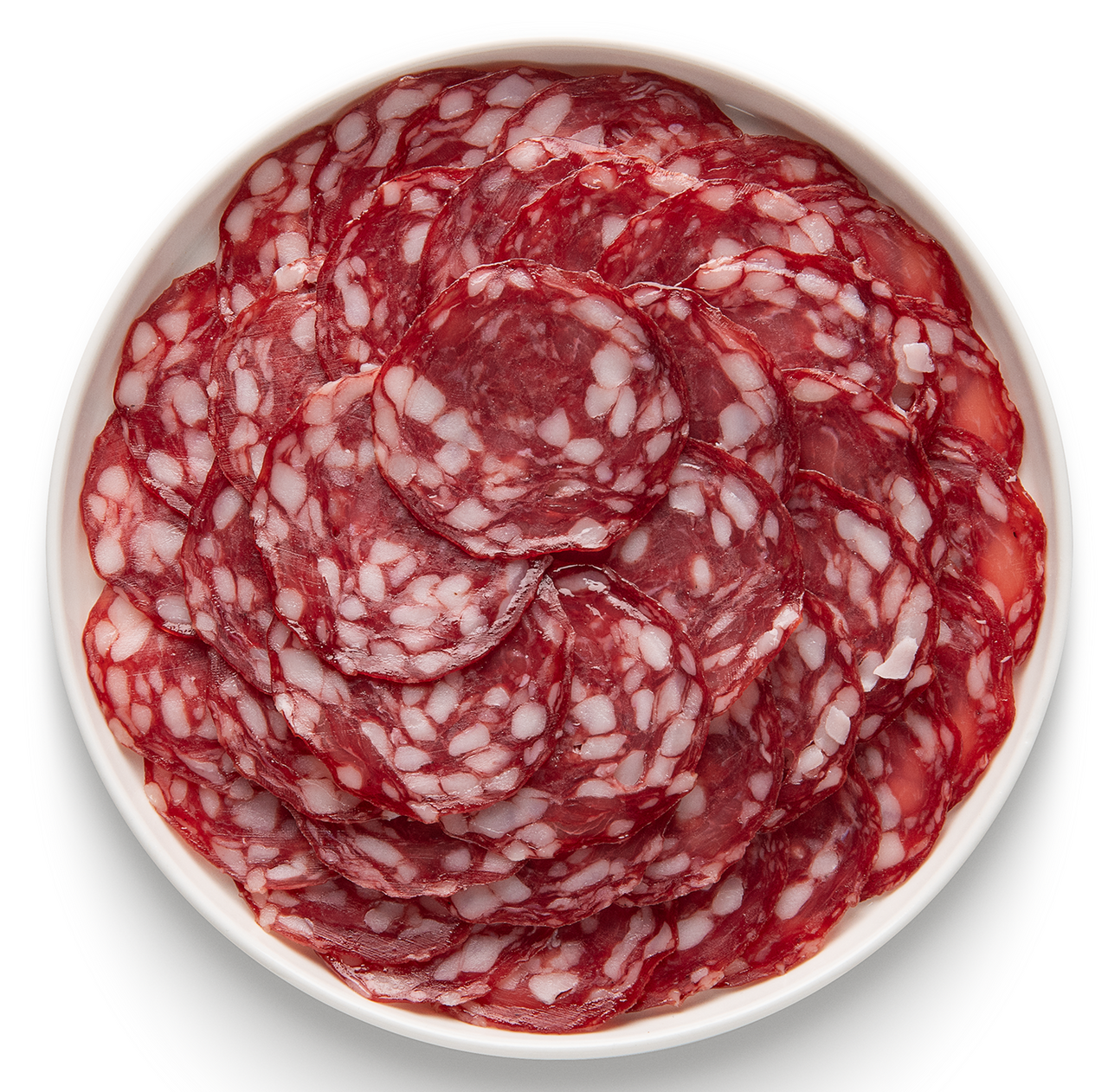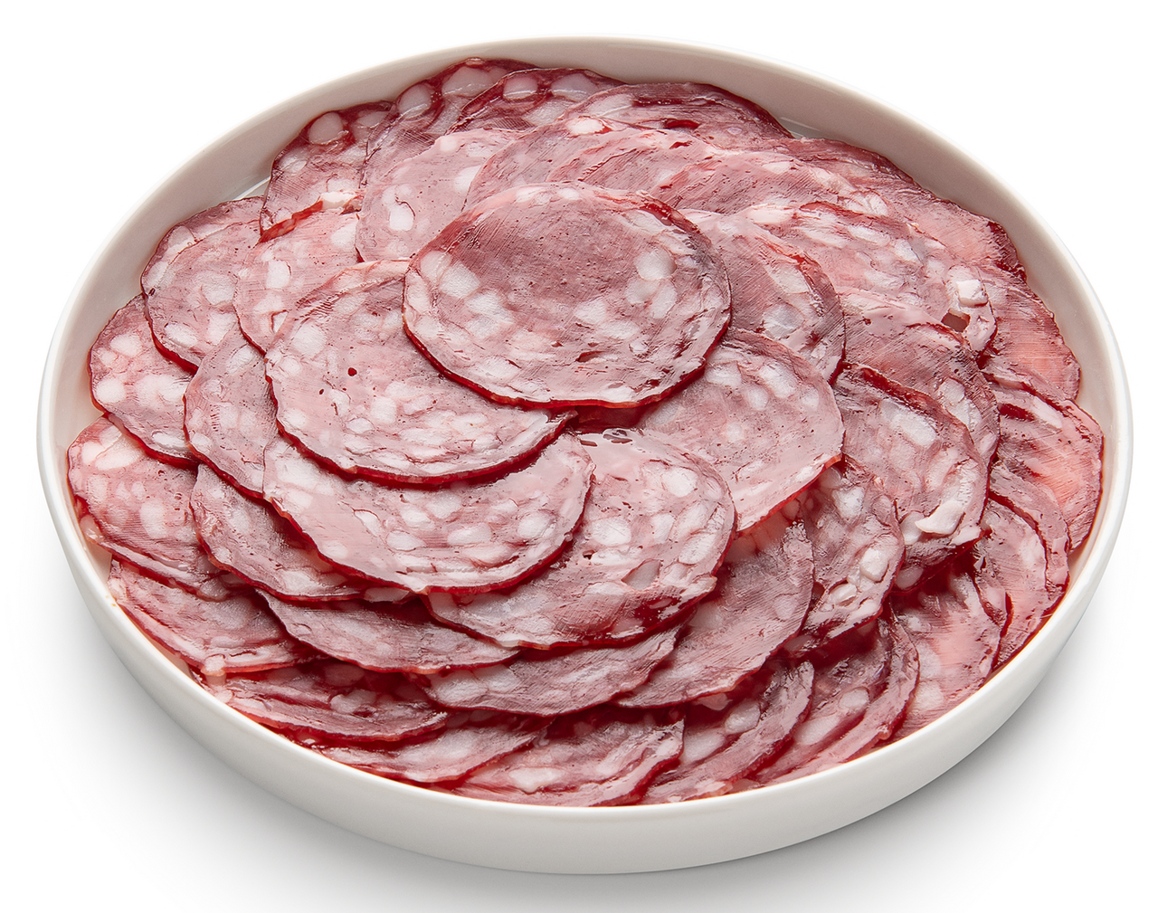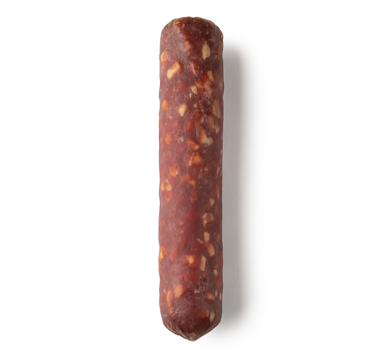 Говядина, шпик, свинина, соль, сахар, пряности, ускоритель созревания, фиксатор окраски Е250, пищевой краситель кармин.