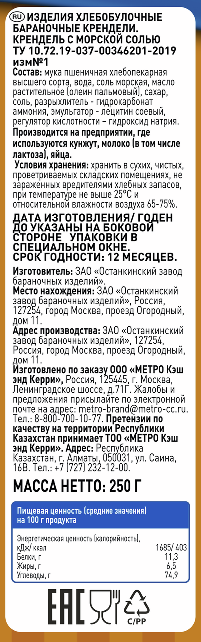Мука пшеничная хлебопекарная высшего сорта, вода, соль морская, масло растительное (олеин пальмовый), сахар, соль, разрыхлитель - гидрокарбонат аммония, эмульгатор - лецитин соевый, регулятор кислотности - гидроксид натрия.