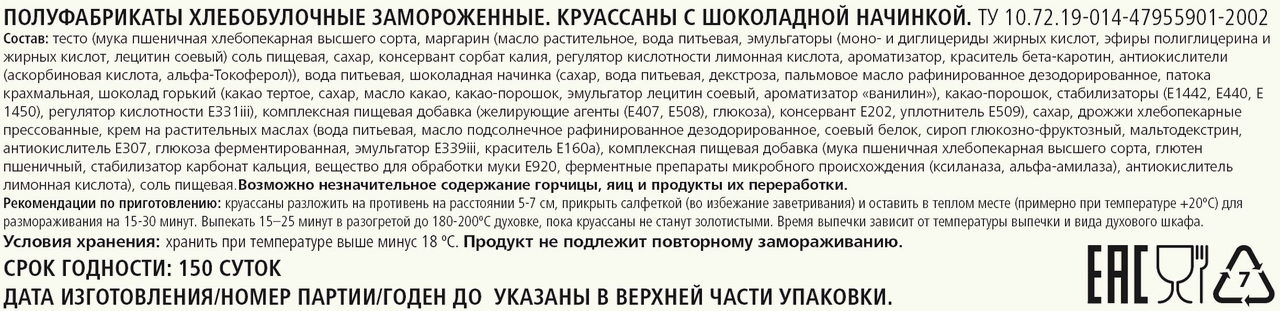 Круассаны замороженные Fine Life - это прекрасный завтрак, который так легко приготовить: нужно разложить их на противень на расстоянии 5-7см, прикрыть салфеткой (во избежание заветривания) и оставить в теплом месте (+20С) для размораживания на 15-30 минут. Выпекать 15-25 минут в разогретой до 180-200С духовке, пока круассаны не станут золотистыми. Время выпечки зависит от температуры выпечки и вида духового шкафа. Продукт не подлежит повторному замороживанию!