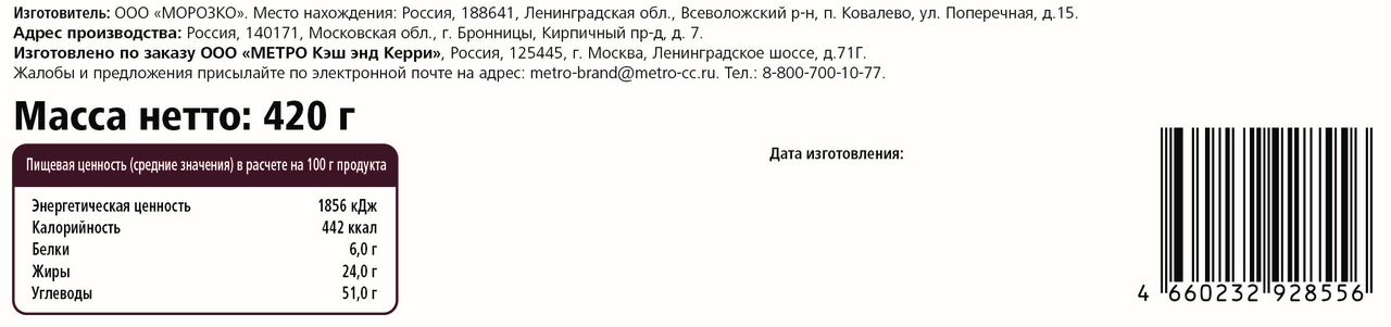 Тесто мука пшеничная хлебопекарная высшего сорта, маргарин масла растительные рафинированные дезодорированные пальмовое и его фракции, подсолнечное, вода питьевая, эмульгаторы моно - и диглицериды жирных кислот, эфиры полиглицерина и жирных кислот, лецитин соевый, соль пищевая, сахар, консервант сорбат калия, регулятор кислотности лимонная кислота, ароматизатор, краситель бета-каротин, антиокислители аскорбиновая кислота, альфа-токоферол, вода питьевая, шоколадная начинка сахар, вода питьевая, декстроза, пальмовое масло рафинированное дезодорированное, патока крахмальная, шоколад горький какао тёртое, сахар, масло какао, какао-порошок, эмульгатор лецитин соевый, ароматизатор ванилин, какао-порошок, стабилизаторы Е1442, Е440, Е1450, регулятор кислотности Е331iii, комплексная пищевая добавка желирующие агенты Е407, Е508, глюкоза, консервант Е202, уплотнитель Е509, сахар, дрожжи хлебопекарные прессованные, крем на растительных маслах вода питьевая, масло подсолнечное рафинированное дезодорированное, соевый белок, сироп глюкозно-фруктозный, мальтодекстрин, антиокислитель Е307, глюкоза ферментированная, эмульгатор Е339iii, краситель Е160а, комплексная пищевая добавка мука пшеничная хлебопекарная высшего сорта, глютен пшеничный, стабилизатор карбонат кальция, вещество для обработки муки Е920, ферментные препараты микробного происхождения ксиланаза, альфа-амилаза, антиокислитель лимонная кислота, соль пищевая.