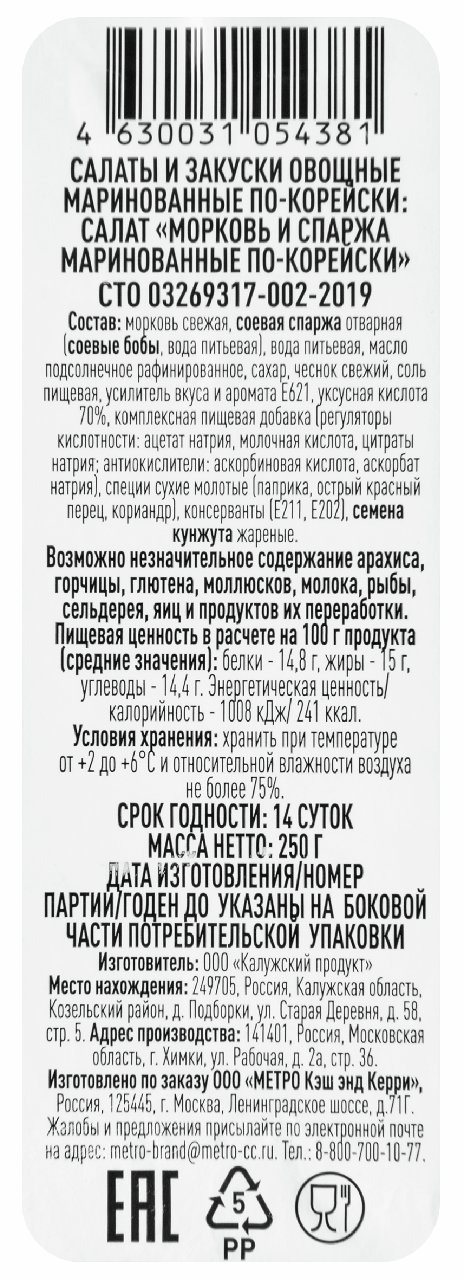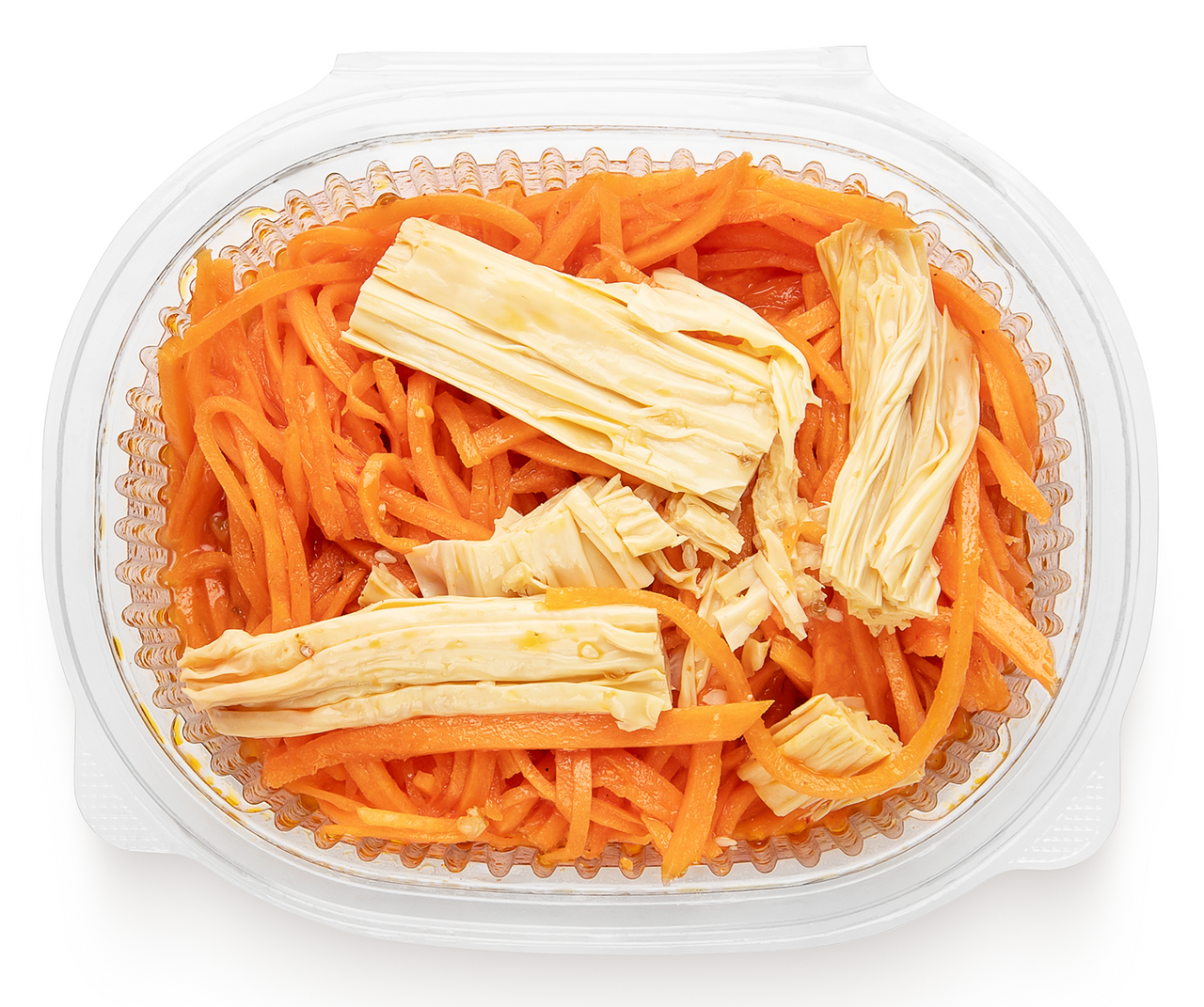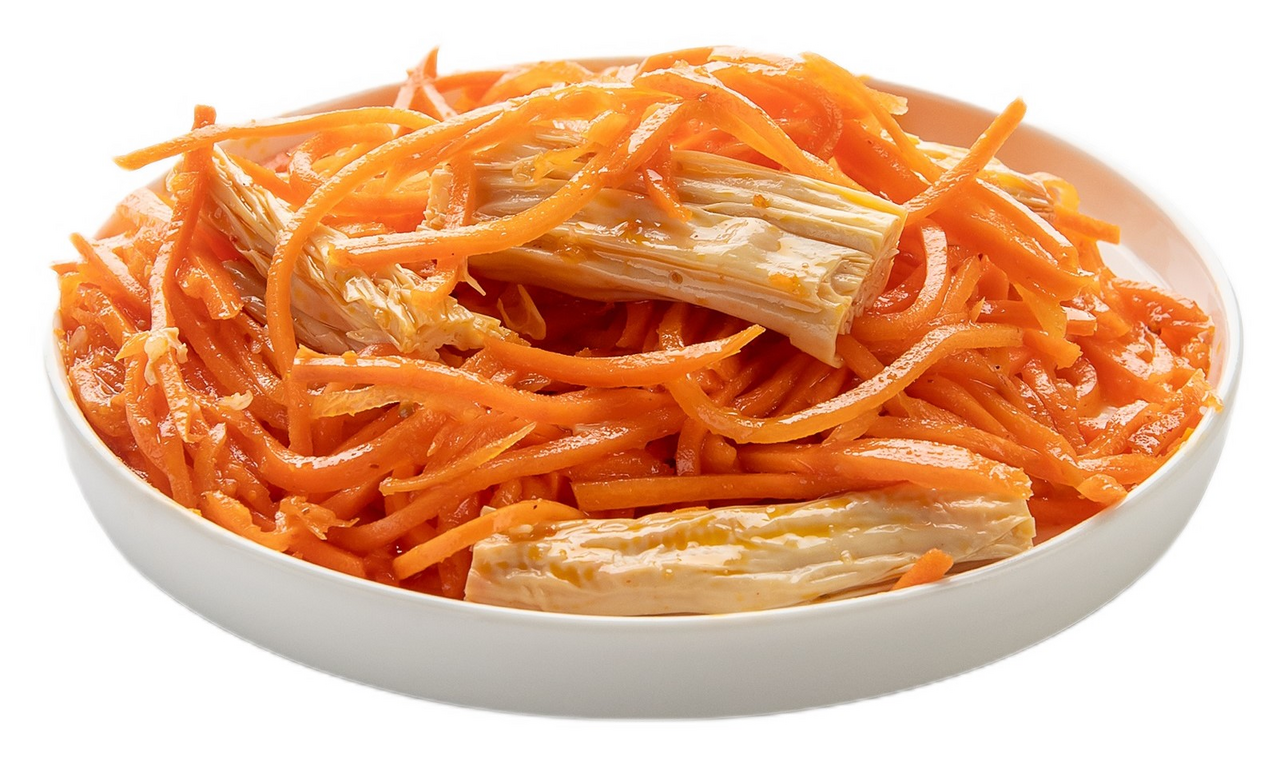 Морковь и спаржа по-корейски 250г точно понравится любителям азиатской кухни. Не все знают, но соевая спаржа не имеет никакого отношения к растению с таким же названием. Соевая спаржа- это уникальный продукт переработки соевых бобов, который производится из соевого молока. Он отличается очень высоким содержанием белка, поскольку представляет собой пенку, собранную с кипяченого соевого молока. Вегетарианцам и постящимся стоит обратить внимание на этот продукт и приготовить спаржу по-корейски в домашних условиях с морковкой.