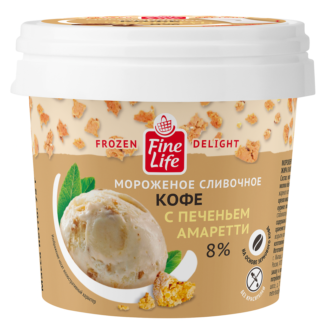 Кофейное мороженое Fine Life с печеньем амаретти понравится даже тем, кто не любит кофе. Для производства используются зернапремиальной арабики средней обжарки, которыенастаиваютсянатеплых сливках и молоке. В мороженое добавлены кусочки миндального печенья Амаретти, которое выпекается на том же производстве. Внутрь стаканчика помещена ложка, так что мороженое удобно есть в любом месте.