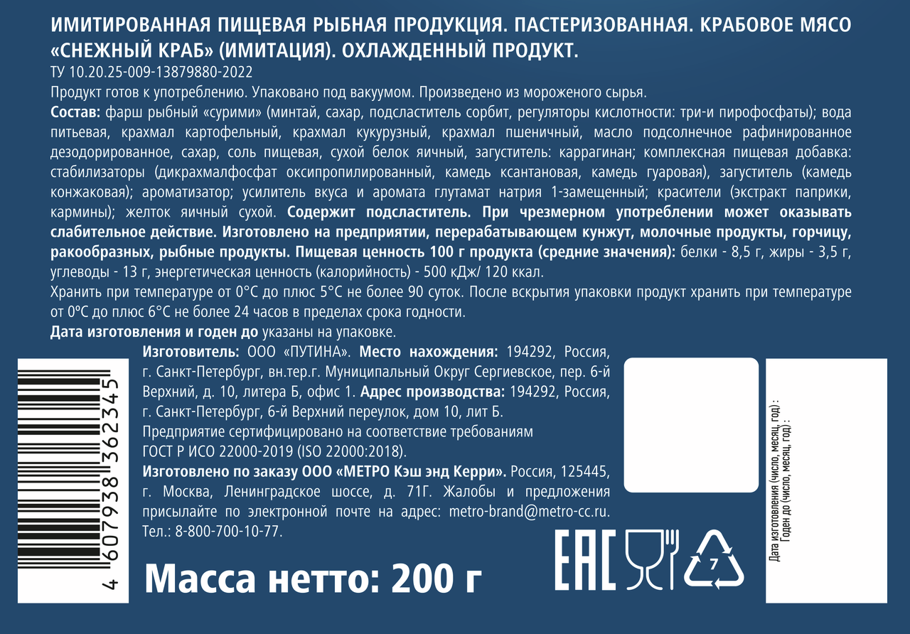 Фарш рыбный сурими (минтай, сахар, подсластитель сорбит, регуляторы кислотности: три-и пирофосфаты); вода питьевая, крахмал картофельный, крахмал кукурузный, крахмал пшеничный, масло подсолнечное рафинированное дезодорированное, сахар, соль пищевая, сухой белок яичный, загуститель: каррагинан; комплексная пищевая добавка: стабилизаторы (дикрахмалфосфат оксипропилированный, камедь ксантановая, камедь гуаровая, камедь конжаковая); ароматизатор; усилитель вкуса и аромата глутамат натрия 1-замещенный; красители: (экстракт паприки, кармины); желток яичный сухой.
