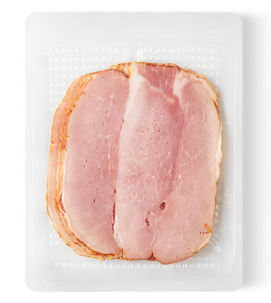 Нежная, сытная закуска из свинины. Продукт изготавливается из сочного мяса с небольшой прослойкой жира. Технология приготовления предполагает копчение на древесных опилках, которые придают характерный аромат. Нарезанный тонкими ломтиками окорок можно подавать как холодную закуску, добавлять в мясную солянку, пасту карбонара, мясные салаты. Продукт подходит для приготовления бутербродов.