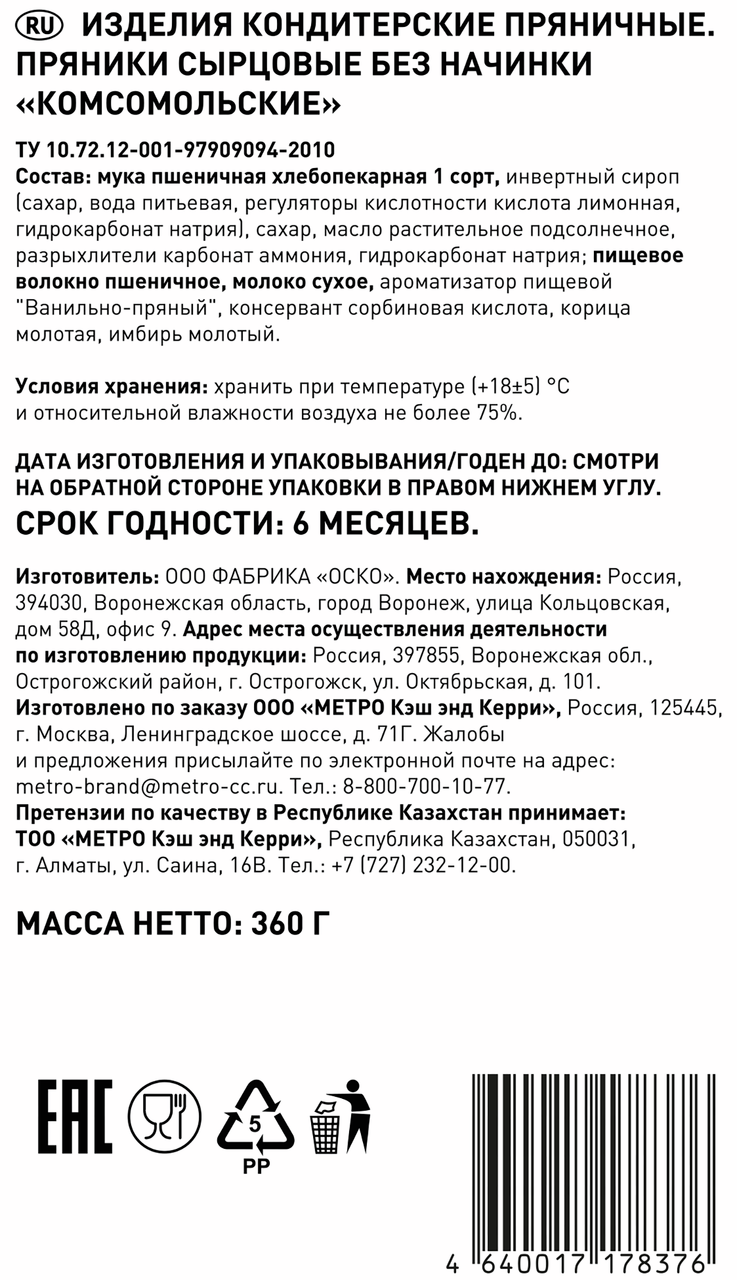 Мука пшеничная хлебопекарная 1 сорт, инвертный сироп (сахар, вода питьевая, регуляторы кислотности кислота лимонная, гидрокарбонат натрия), сахар, масло растительное подсолнечное, разрыхлители карбонат аммония, гидрокарбонат натрия, пищевое волокно пшеничное, молоко сухое, ароматизатор пищевой "Ванильно-пряный", консервант сорбиновая кислота, корица