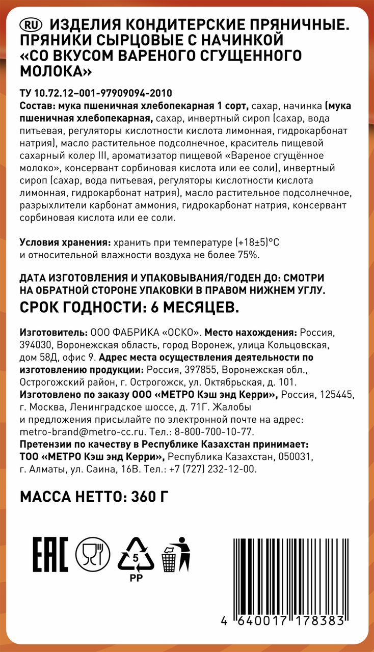 Мука пшеничная хлебопекарная 1 сорт, сахар, начинка мука пшеничная хлебопекарная, сахар, инвертный сироп сахар, вода питьевая, регуляторы кислотности кислота лимонная, гидрокарбонат натрия, масло растительное подсолнечное, краситель пищевой сахарный колер III, ароматизатор пищевой Варёное сгущённое молоко, консервант сорбиновая кислота или ее соли, инвертный сироп сахар, вода питьевая, регуляторы кислотности кислота лимонная, гидрокарбонат натрия, масло растительное подсолнечное, разрыхлители карбонат аммония, гидрокарбонат натрия, консервант сорбиновая кислота или ее соли.
