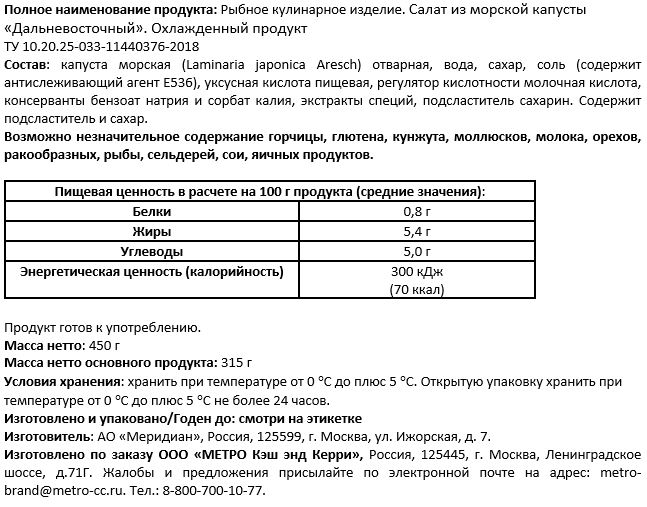 Капуста морская (Laminaria japonica Aresch) отварная, вода, сахар, соль (содержит антислеживающий агент E536), уксусная кислота пищевая, регулятор кислотности молочная кислота, консерванты бензоат натрия и сорбат калия, экстракты специй, подсластитель сахарин. Содержит подсластитель и сахар.