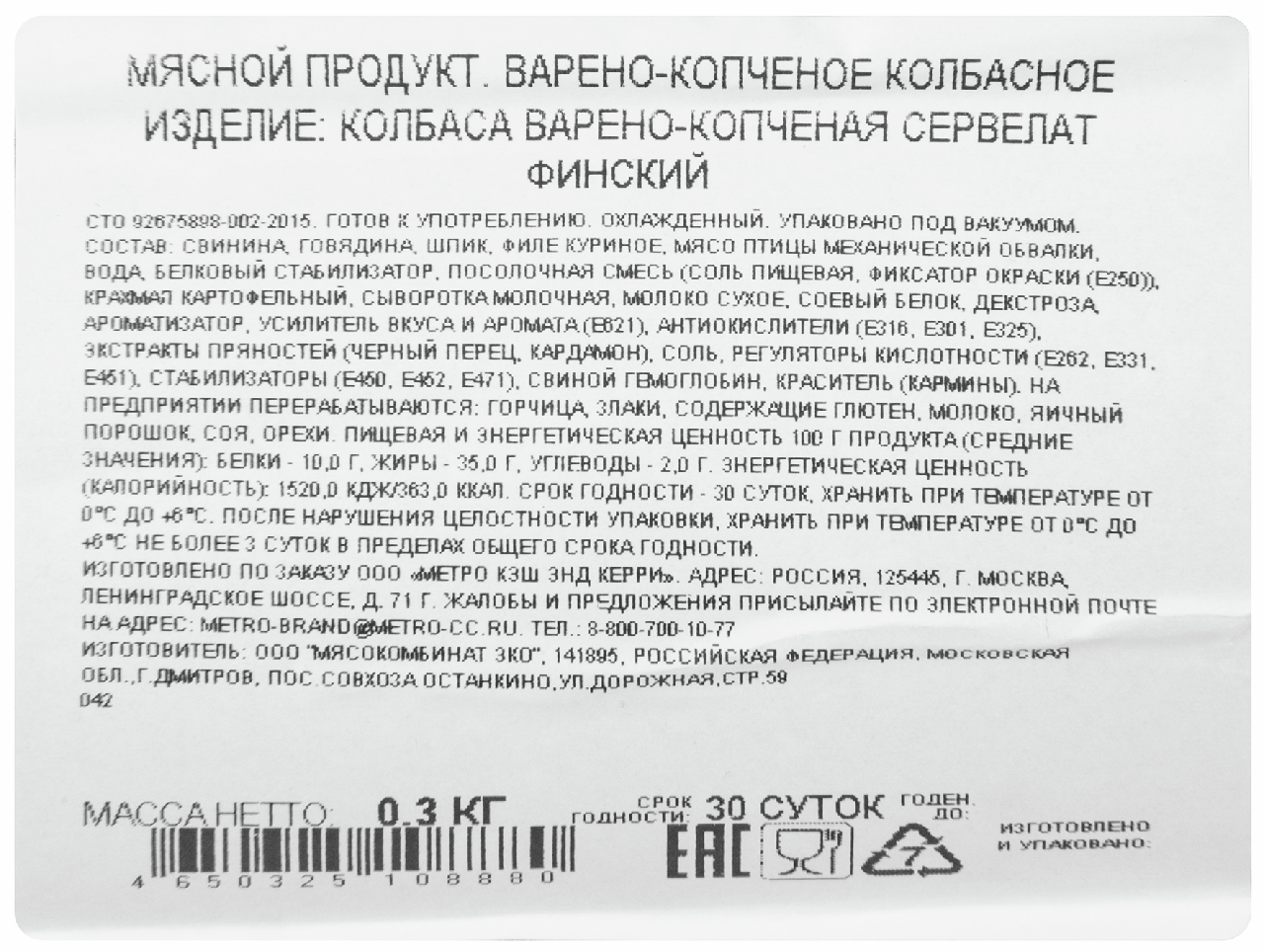 Свинина, говядина, шпик, филе куриное, мясо птицы механической обвалки, вода, белковый стабилизатор, посолочная смесь соль пищевая, фиксатор окраски Е250, крахмал картофельный, сыворотка молочная, молоко сухое, соевый белок, декстроза, ароматизатор, усилитель вкуса и аромата Е621, антиокислители Е316, Е301, Е325, экстракты пряностей черный перец, кардамон, соль, регуляторы кислотности Е262, Е331, Е451, стабилизаторы Е450, Е452, Е471, свиной гемоглобин, краситель кармины.