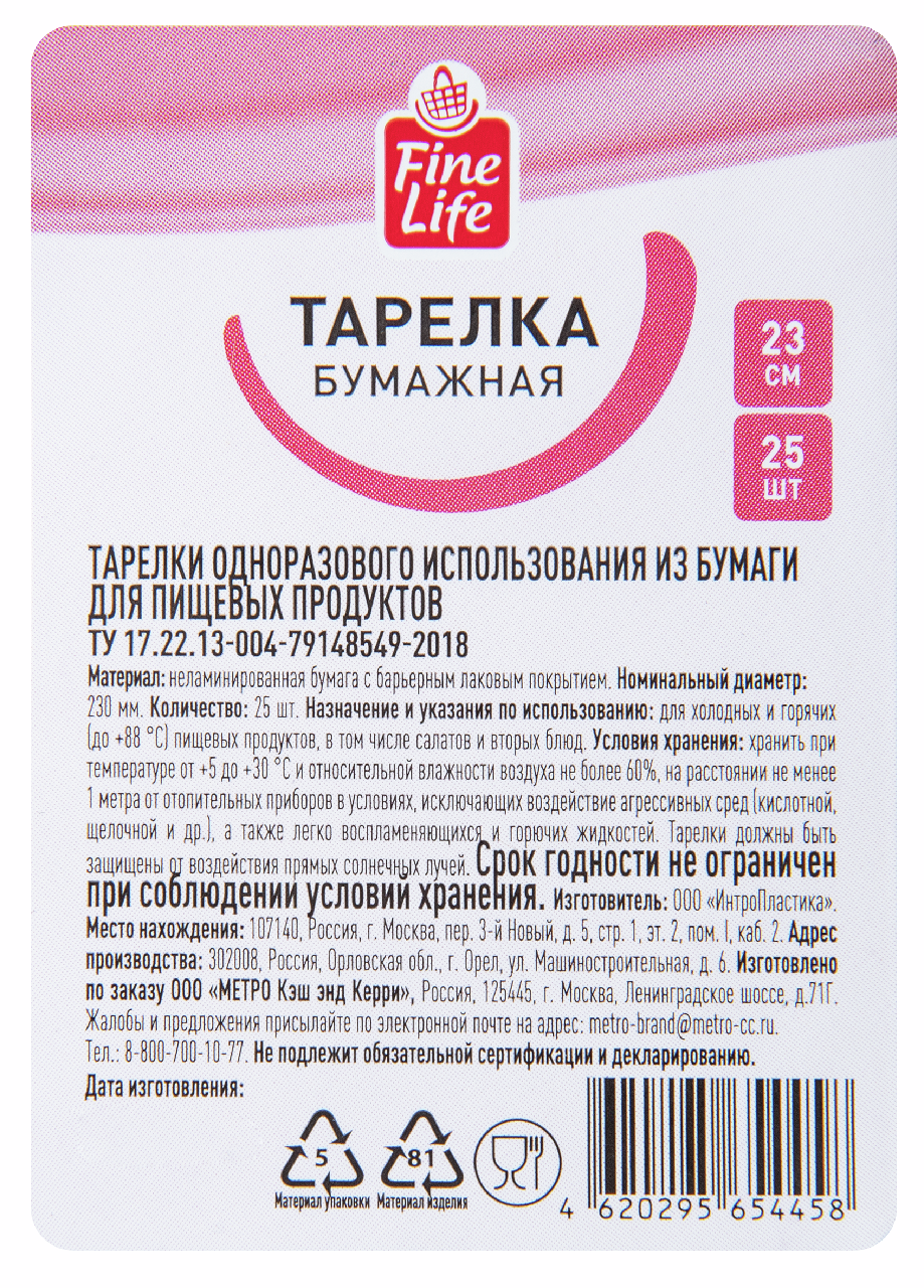Fine Life Тарелка одноразовая бумажная 23см, 25шт