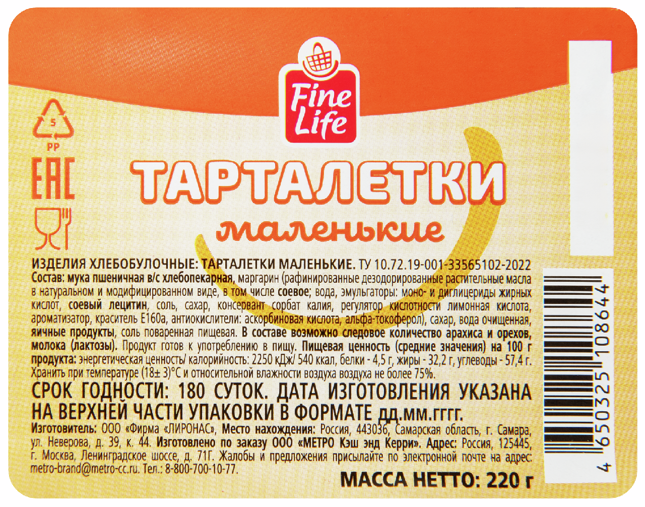 Fine Life Тарталетки маленькие 30шт, 220г