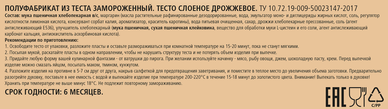 Благодаря качественным ингредиентам и тщательно подобранной рецептуре слоёного теста Fine Life, вы можете создавать восхитительные изделия без лишних забот. В упаковке 2 пласта. Способ приготовления: 1. Освободите тесто от упаковки, разложите пласты и оставьте размораживаться при комнатной температуре на 15-20 минут, пока не станут мягкими. 2. Посыпая мукой, раскатайте пласты в одном направлении, чтобы не нарушить структуру теста и не потерять объем изделия при выпечке. 3. Придайте любую форму вашей кулинарной фантазии - от ватрушки до пирога. При желании используйте начинку - мясо, рыбу овощи, джем, шоколадную пасту, крем. Перед выпечкой изделие можно смазать яйцом, посыпать маком, тмином, кунжутом. 4.Разложите изделия на противне в 5-7см друг от друга, накрыв салфеткой для предотвращения заветривания, и поместите в теплое место до увеличения объема заготовки. Предварительно разогрейте духовку, поставьте в нее емкость с водой и выпекайте изделие при температуре 200-220С в течение 15-18 минут до золотистого цвета.